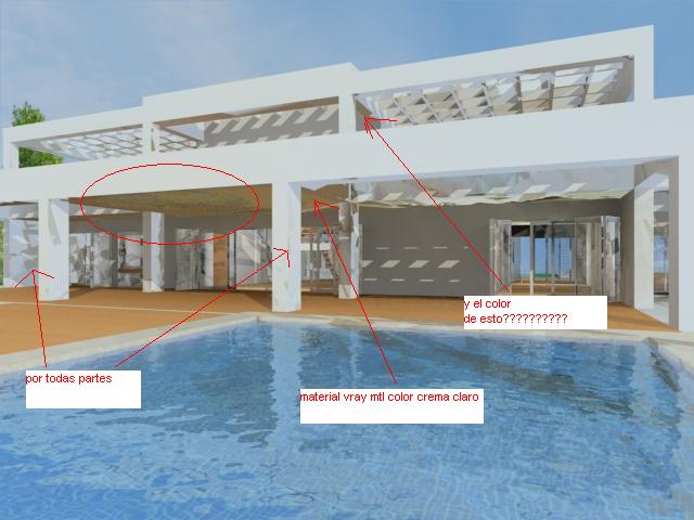 Hola, aquí tenéis una imagen en la que me aparecen unas manchas que no sé por qué me salen, son manchas tanto en el texo (que esas son verdes y con puntos de colores) tanto como en el material blanco (que son como unas sombras raras), para colmo el material del techo del porche es un simple Vray (*.mat) con un color crema bastante claro y me sale medio marrón.