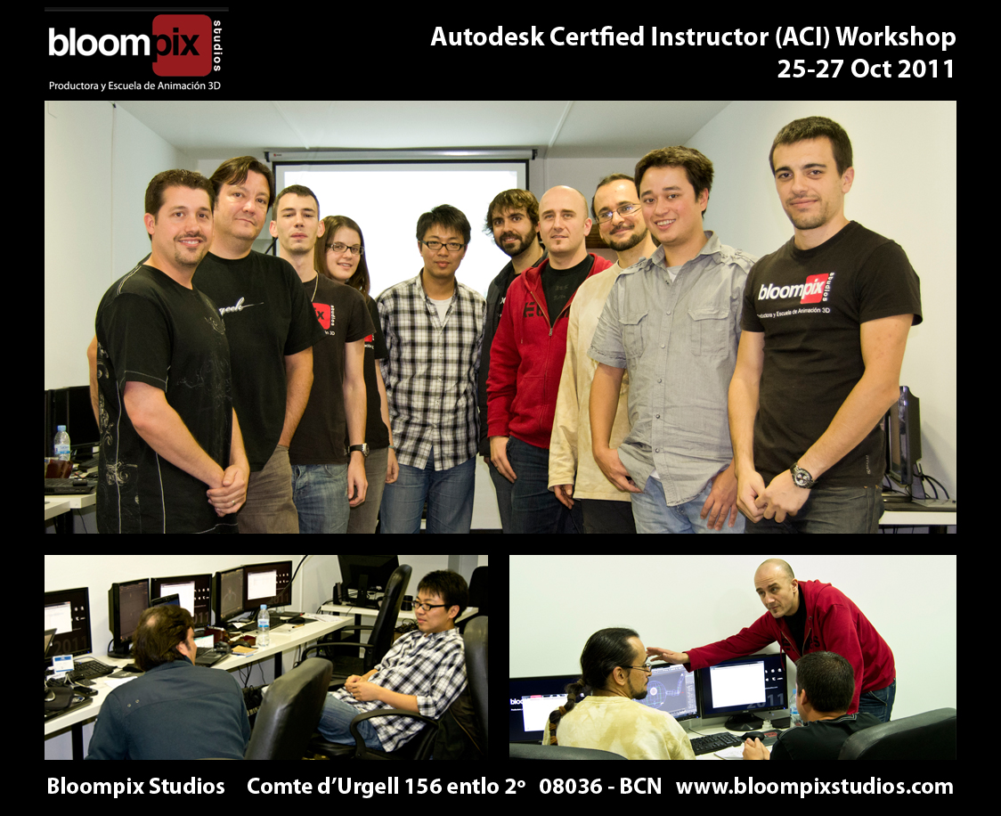 La semana pasada Blompix Studios acogió el evento de certificación de profesores de Autodesk en España. Durante el evento, de tres días de duración, pudimos conocer a muchos profesionales del sector venidos desde otros países y de distintos sectores. Fueron tres días donde cada candidato debía realizar una clase de un tema concreto en su software. Fue muy interesante ya que tuvimos profesionales que se certificaban de 3ds Max, Autodesk Maya y Softimage así que, pudimos ver un poco de cada. Aunque el tiempo no acompañó (llovió todos los días) fue un evento de lo más interesante y divertido.