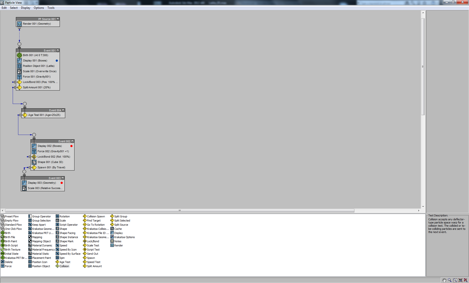 El siguiente paso es usar un Script Operator o Event Script dentro del Event que controla las gotas. Aquí puedes programar algo sencillo: cuando una partícula de la gota colisione con una partícula de agua estancada, esa última se elimina o se suma a la gota, aumentando su tamaño o masa. Esto simula que la gota está absorbiendo las partículas que encuentra en su camino.