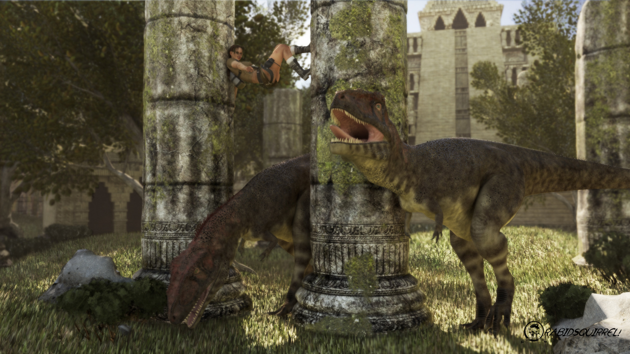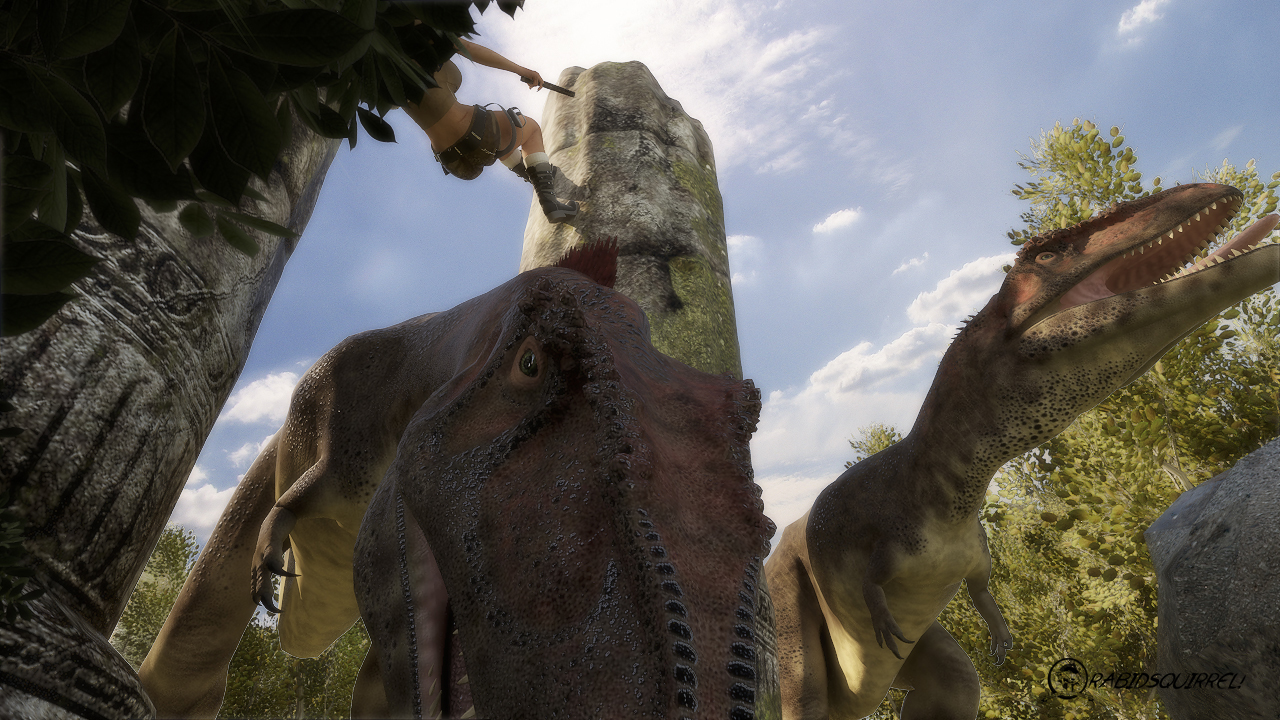 Este es un remake de un trabajo que hice hace ya más de un año, como para ver alguna evolución. Un mejor modelo, dinosaurios más grandes, un escenario parecido, pero más pesado, otro motor de render, y listo. Además, de los renders finales he puesto una comparativa de los modelos de Lara y el trabajo anterior. Esta vez utilicé Mental Ray. C&c bienvenidos.