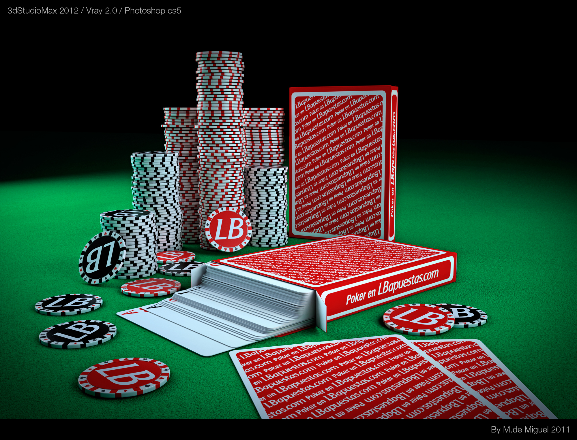 Aprovecho el día para subir otro render, en este caso una escena de una baraja con fichas de póker. Los UV de las fichas están mal, me resulta muy difícil hacerlos, no he dado con la proyección adecuada. Bueno espero vuestros comentarios, gracias a todos.