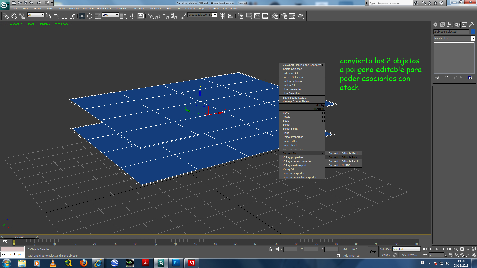 A lo mejor os reis un buen rato con la pregunta, pero es que, no he conseguido dar con la respuesta en la red, me pasa que si creo un plano y después lo clono, de la forma que prefirais, haciendo un mirror, clone, consigo dos piezas iguales, bien pues ahora utilizo atach para unir una a otra y que los dos planos formen un solo conjunto, hasta ahí nada del otro jueves, pero aquí viene la madre del cordero, no consigo unir de ningún modo los vértices del plano superior con los del plano inferior, digo vértices, pero tampoco me deja unirlos con bridge, ni target weld, ni gaitas, no se chico, a lo mejor le he dado tantas vueltas que ya los árboles no me dejan ver el bosque, en fin, que si alguien me echa una mano virtual por aquí, se lo agradeceré en el alma, si os parezco muy pelma, no os cortéis y llamadme pelmazinguer.