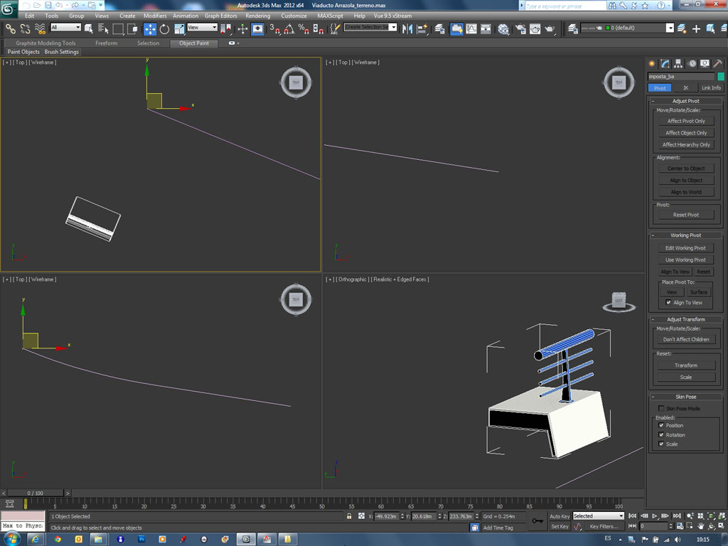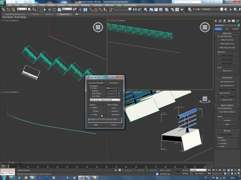 Estoy modelando un viaducto, de unos 2000 m, con trazado curvo en planta (de radio variable) y con pendiente longitudinal. Me he creado un modelo de un fragmento de la barandilla, cuya longitud es de 2preguntay mi idea era partir de una Spline que define la trayectoria del puente, usar el spacing tool de 3d Studio para clonarla repetidamente adaptándome a la curva. La teoría sonaba bien, pero en la práctica estoy teniendo muchos problemas, si no marco la opción follow, lógicamente según avanza la curvatura de la trayectoria, se ve peor y no me vale. Pero si marco la opción follow, se me descoloca todo absolutamente. Debe ser algún problema de pivotes, que estén mal colocados o algo de eso, pero soy bastante novato en el tema y no lo controlo bien, si alguien me puede dar alguna indicación se lo agradecería enormemente.