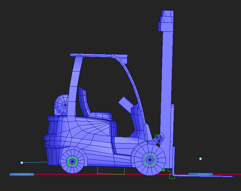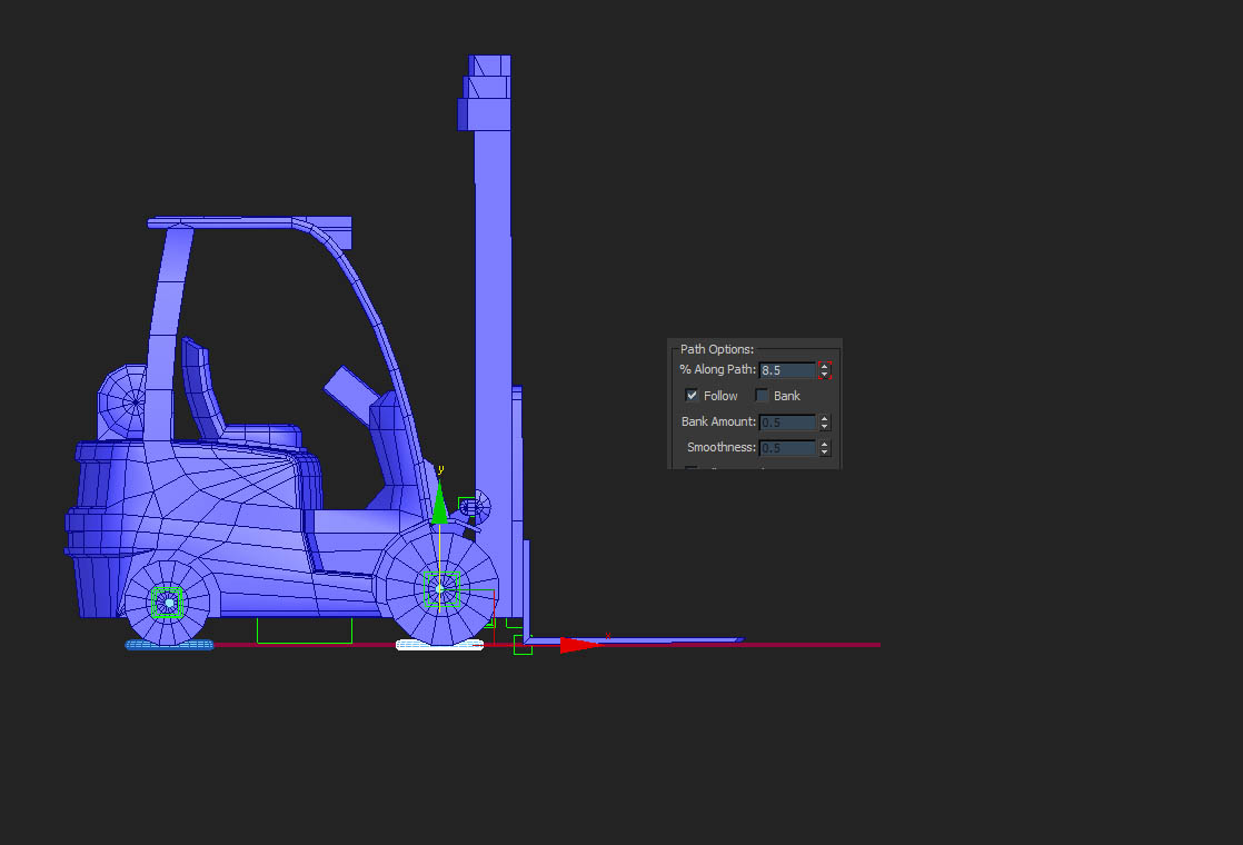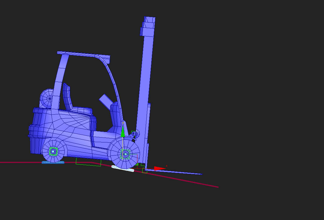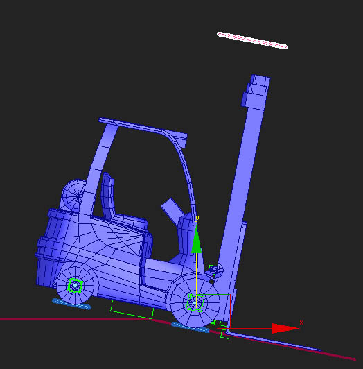Tengo una elevadora y necesito que sea capaz, mediante el uso del Path constraint para crear el camino y que luego ello siga automáticamente con el consiguiente ahorro de tiempo, de cambiar de alturas de forma real. Como se ve en la image_01 si yo hiciese un control principal, al bajar la cuesta, las ruedas de atrás quedarían en el aire.