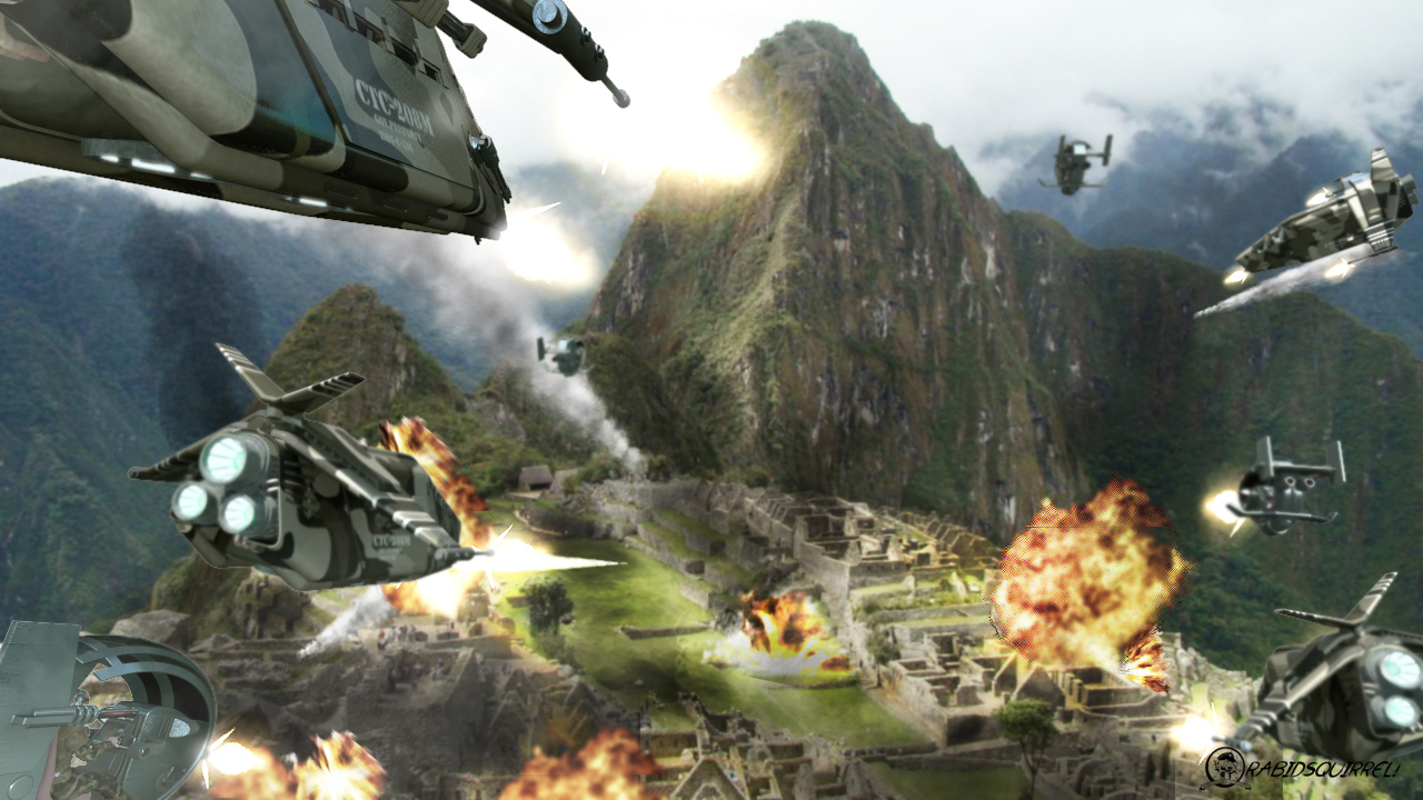 Ok, mo es que tenga algo como macho picchu, solo quise ver cómo se vería en una situación como esta. Empecé este proyecto hace unos días ya, solo que recién lo terminé, render en Mental Ray y mensaje en After Effects y Adobe Photoshop. Un render de la flota volando y uno del ataque. Sin intención de ofender a ningún compatriota.