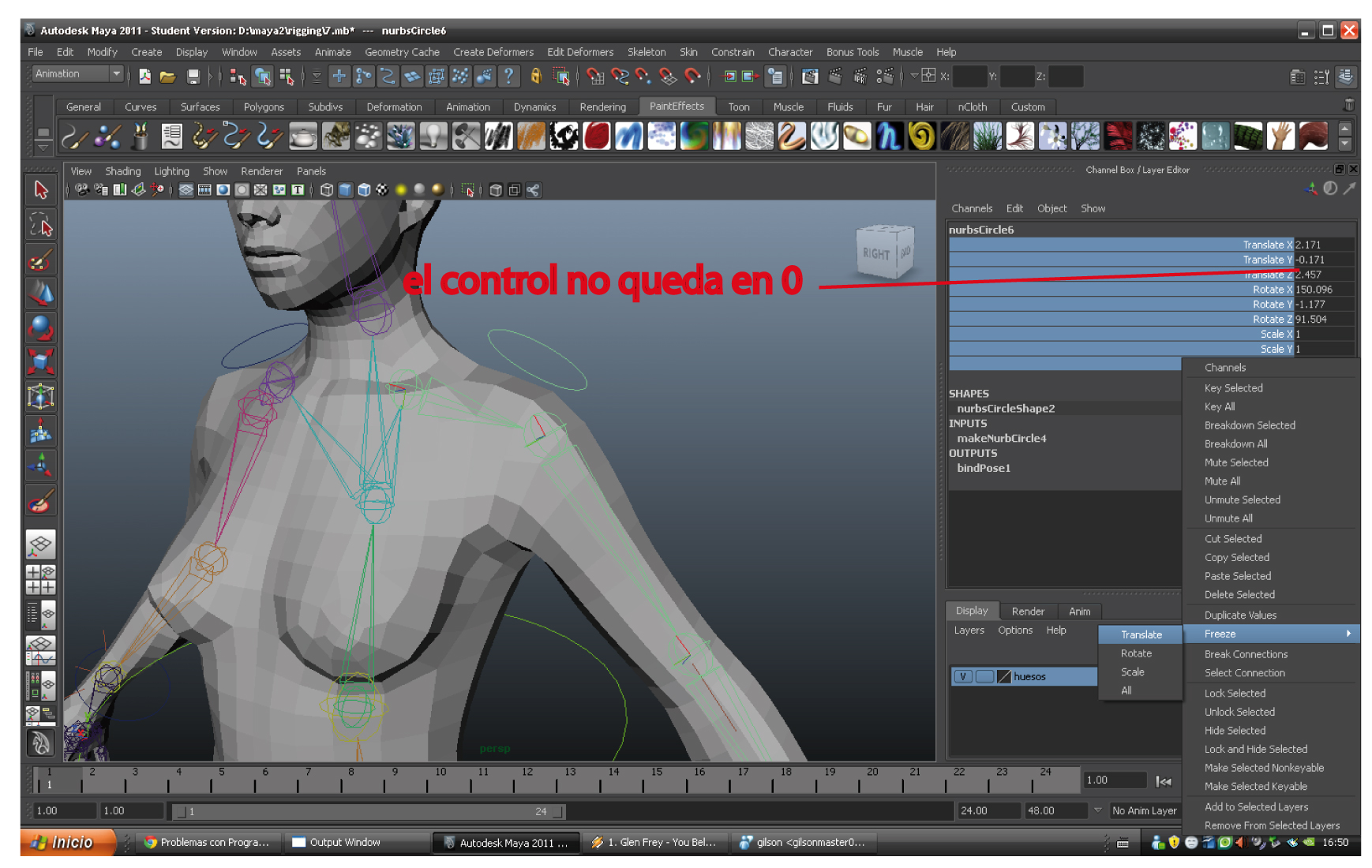 Cordial saludo para todos, señores luego de estudiar cómo animal rigging en Maya, me encuentro con este problema, al querer hacer un freeze para que los círculos tengan la transformación en cero y poder riggiar y animar cómodamente, ha sido imposible que resulte, es decir voy a oprimir freeze y los controles (círculos) no me quedan en ceros como debería ser, no sé si es porque están emparentados, la verdad no tengo idea y he buscado la forma, pero sin resultados.