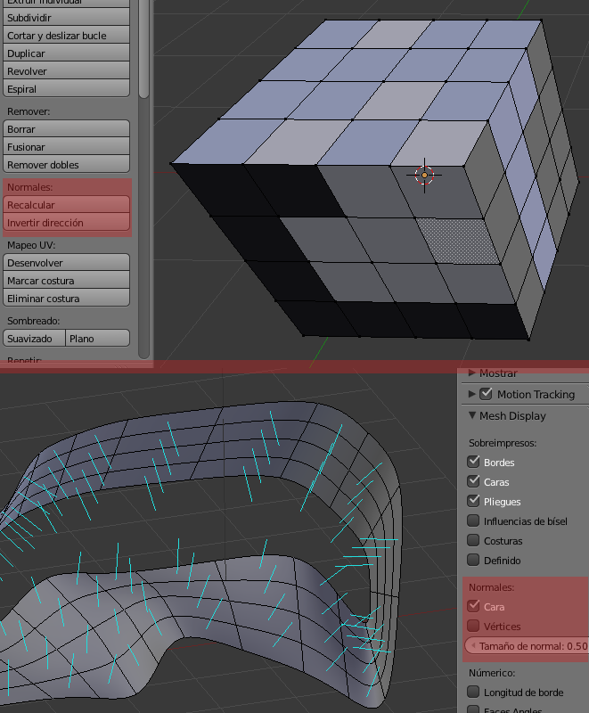 Ctrl+N o sino tienes las opciones de normales de la cara en el panel de la tecla (el de la izquierda). Inclusive en el panel n (de la derecha) tienes para activar los hilos de las caras para hacer un poco más gráfico el tema de las normales.