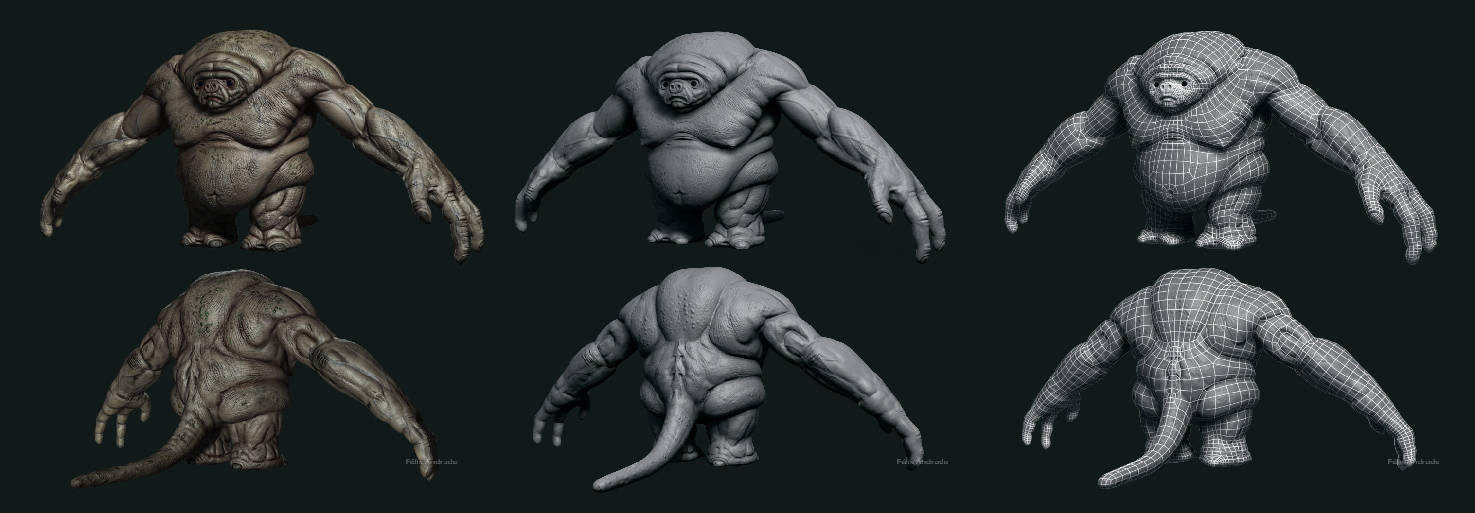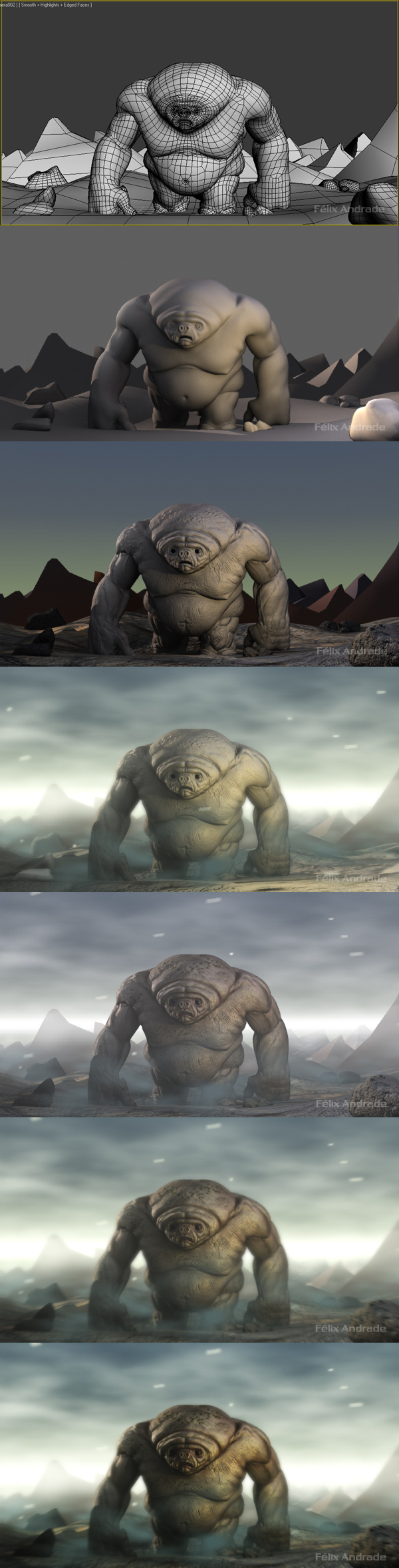 La base la modelé en 3ds Max, luego detallé y retopolicé en ZBrush, las texturas en Adobe Photoshop, la composición también está hecha en 3dsMax (sin plugins), a excepción de la última imagen de la tira que puse donde aumente el contraste en Adobe Photoshop. Me parece que la penúltima imagen se ve mejor que la que está cotrastada, no sé, ¿Qué dicen ustedes?