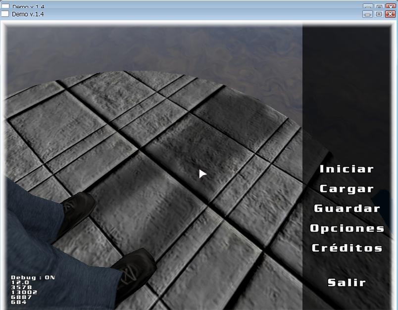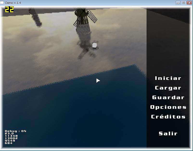 Las sombras son shadowmap (cartográficas) con texturas Bump, el agua es un cubeface con texturas Bump, las cuales muevo con positiontexture y les aplico dot3 en la mezcla, las texturas se mueven en el bucle principal con positiontexture.