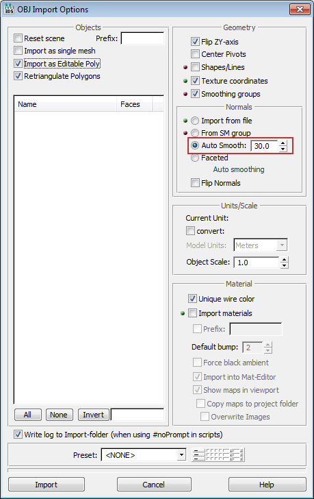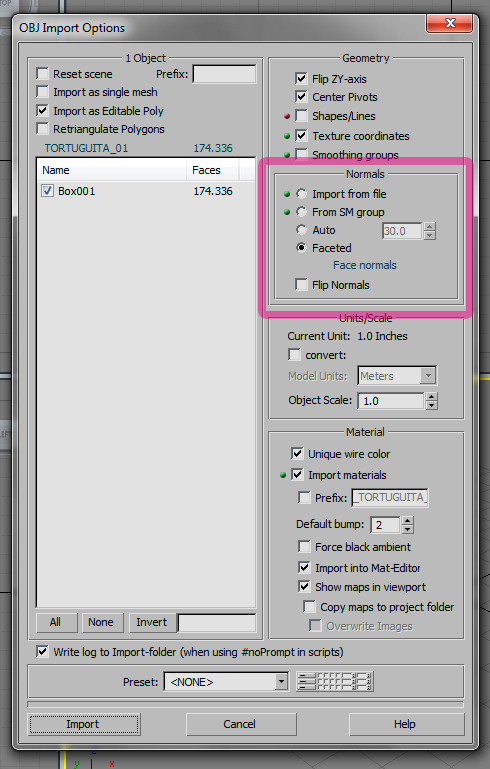 Hola. Yo que ando también trasteando con el 3ds Max 2012 pero el design en mi caso, he tenido veces en que al importar.obj, me ha pasado lo mismo. Lo que he hecho ha sido utilizar la opción auto Smooth a 30.0, en vez de aceptar import from file, esto combinado con un TurboSmooth a 1 iteración es más que suficiente en la mayoría de los casos. Un saludo.
