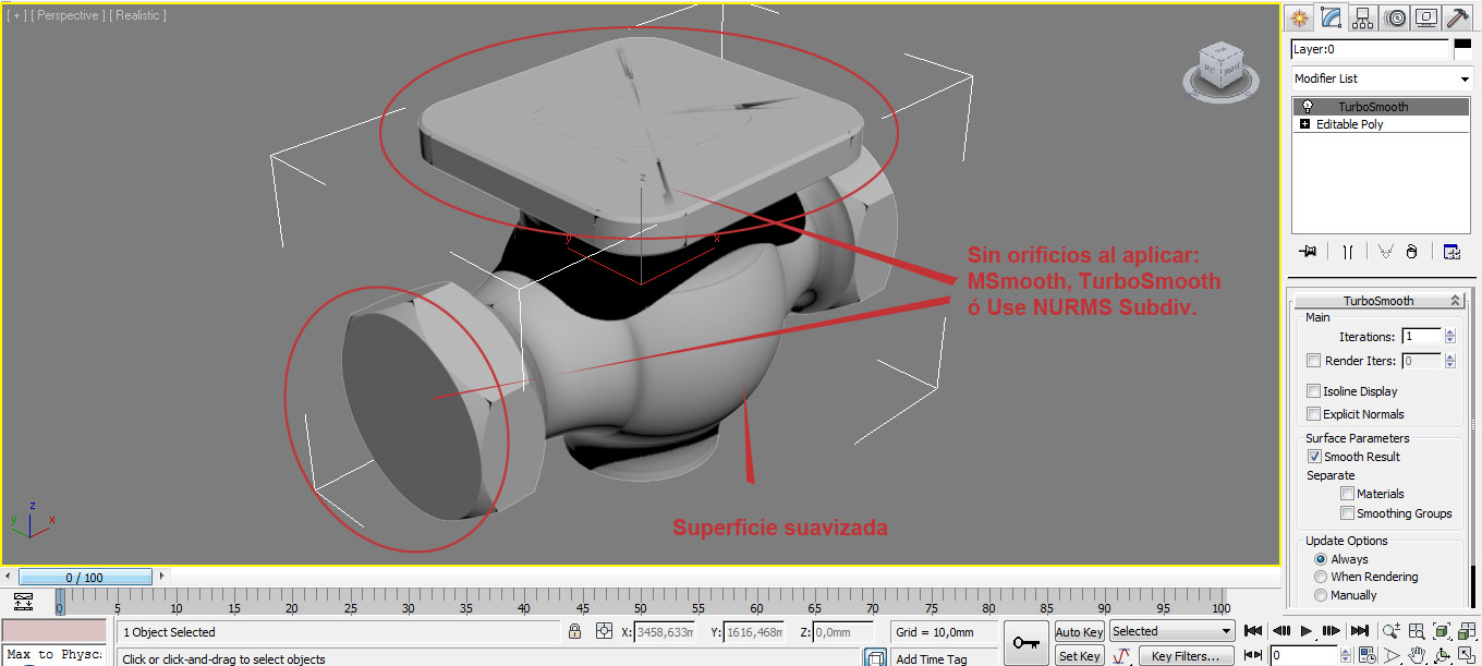 Hola. Yo normalmente modelo en Cad, y me ha surgido un problema al importar un.dwg a max, en el que me aparecen facetadas las caras de una parte de la pieza. En teoría con un TurboSmooth o un msmooth, o quizá utilizando la herramienta use Nurms sub, de la parte de Edit Poly, podría ser que fuese subsanado, pero, no, ya que si hago cualquiera de estos modificadores, se me tapan los taladros de la pieza y no sé cómo hacer para que me quede suavizado, sin que se me modifique la geometría.