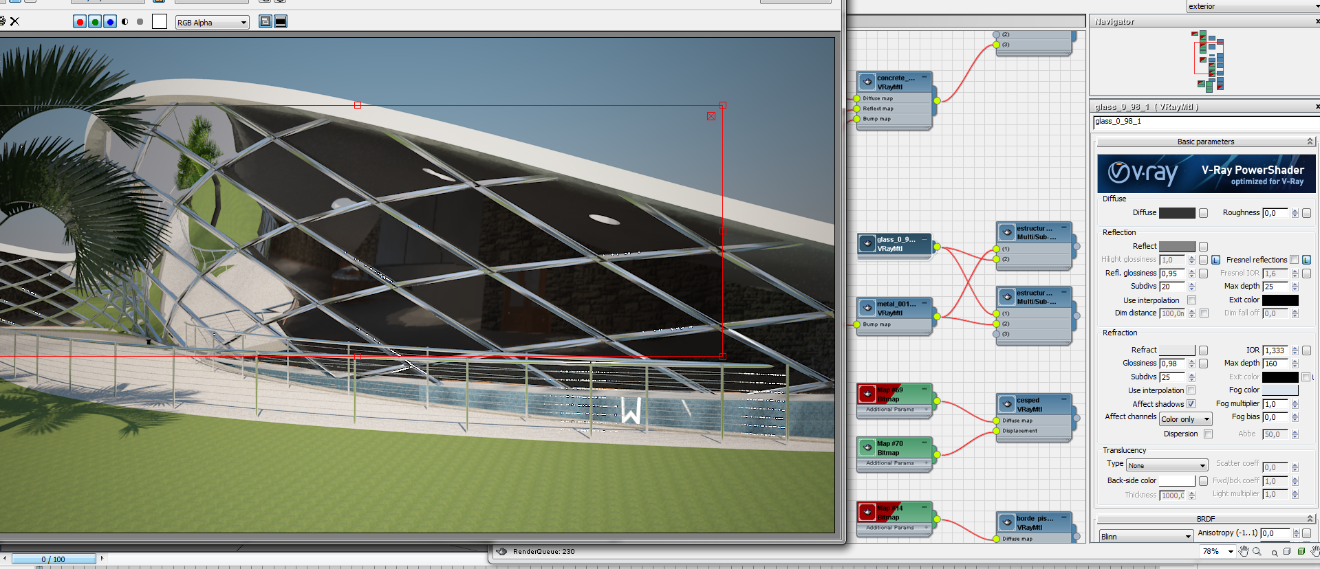 Bueno el cristal era un plano, no tenía grosor así que, me fui de nuevo a Revit y le di 2cm. Si aumentaba el IOR en refraction aumentaba el reflejo, pero con deformación en las puntas de cada cristal, así.