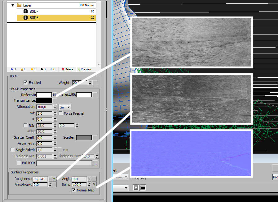 La primera capa bsdf (la de 80) quiere decir que tiene un peso del 80% sobre el otro del 20% (se fusionan las dos en este porcentaje), es la que don la información del color del objeto, se voz para que se en esta donde tenemos la textura de color en la casilla reflect 0 y porque el roughness es del 100% (este 100% significa que toda la luz se dispersa en diferentes orientaciones y por lo tanto, no brilla, si ponemos a 0 veríamos que la luz se refleja en una sola dirección y por lo tanto tendríamos un espejo, un 50% sería un blur reflection del Vray (reflejo burros). La segunda capa bsdf (la del 20) le da un pequeño reflejo en la madera, en ésta el roughness esta controlado por un mapa (podríamos prescindir de el y sólo tener el valor) que le don cierto reflejo, reflejar 0 tenemos una imagen en blanco y negro que nos dice que partes reflejan y cuáles no. Las dos capas tienen para dar relieve un mapa de Normal Map extraído con un plugin para Adobe Photoshop muy útil, lo ndo que puede conseguir gratuitamente haciendo clic en el enlace y tiene un tutorial muy bueno aquí.