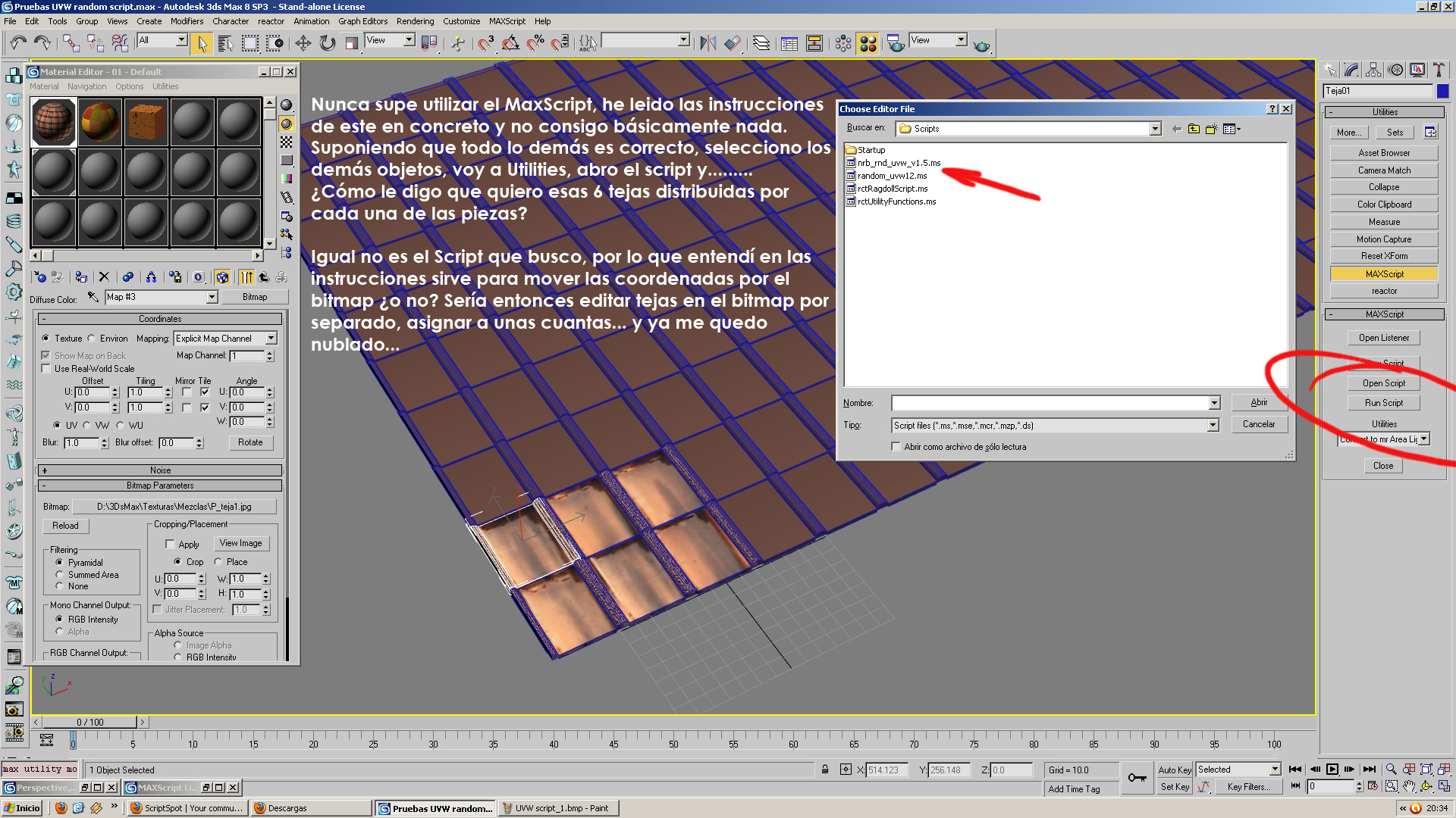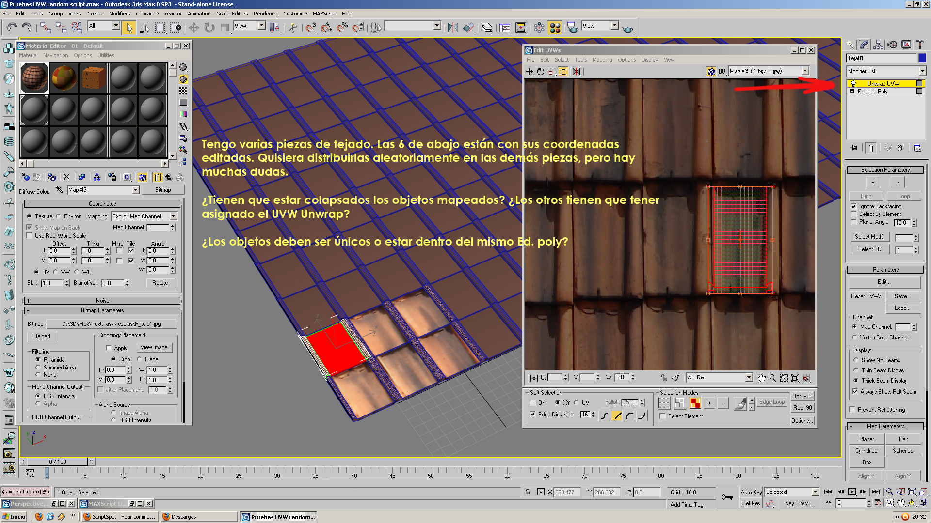 Acabo de ver esto, no, este script no hace eso. La solución más sencilla que se me ocurre es que recortes las tejas diferentes y hagas materiales diferentes, pero básicamente iguales, digamos: teja1, que es una teja vieja y medio rota, teja2, que es una teja cubierta con musgo, teja3, que es la teja limpia, para asignarlos aleatoriamente a tus tejas, todas iguales y todas con el mismo mapeado apropiado a tus bitmaps de teja, eso se puede hacer con un random select y varias pasadas, o con un script específico de random material, yo uso los de Blevins para blur, que ahora son soulburn. http://www.neilblevins.com/cg_tols/s...urnscripts.htm.