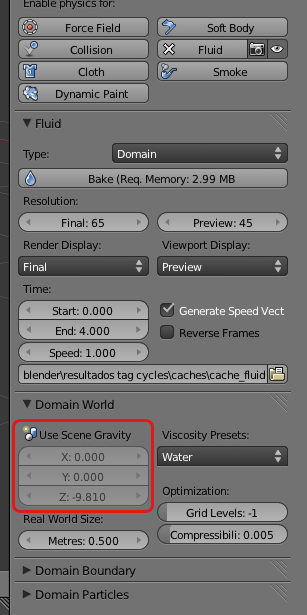 Estoy trasteando con la simulación de fluidos en Blender 2.6, y cuando creo un domain los controles de gravedad me salen desactivados ¿alguien podría decirme por qué?