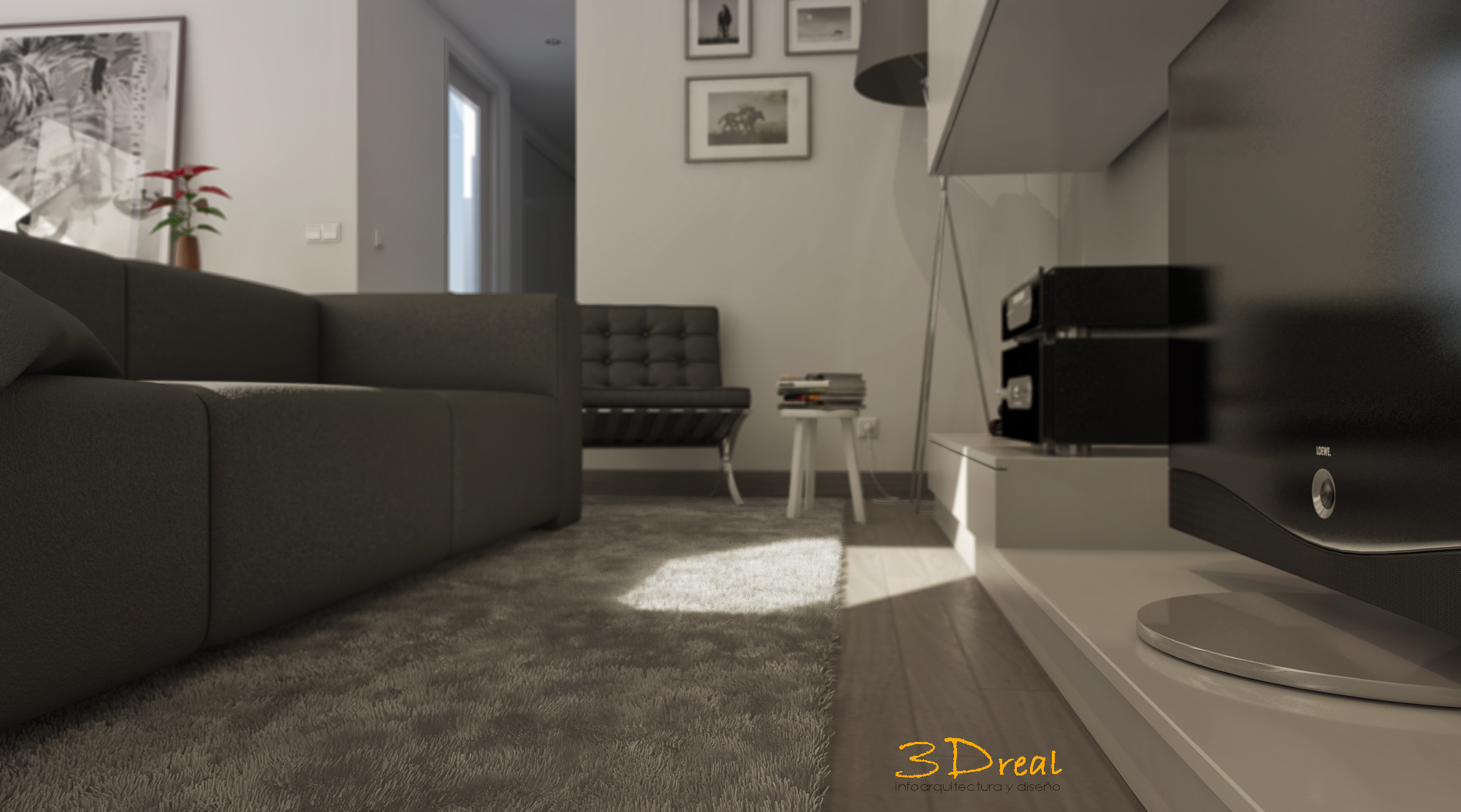 Me gusta la imagen, pero le veo dos cosas. Una es que le falta contraste, la imagen está un poco lechosa. Y dos, creo que el Dof deberías de hacerlo al revés, difuminando lo que está cerca y dejando nítido el fondo, ya que el primer plano no cuenta nada (un trozo de tele que es un gran porcentaje de la imagen en negro y un trozo de sofá) y los elementos interesantes (la banqueta, equipo de música, los cuadros, el sofá barceló.) los dejas al fondo difuminados.