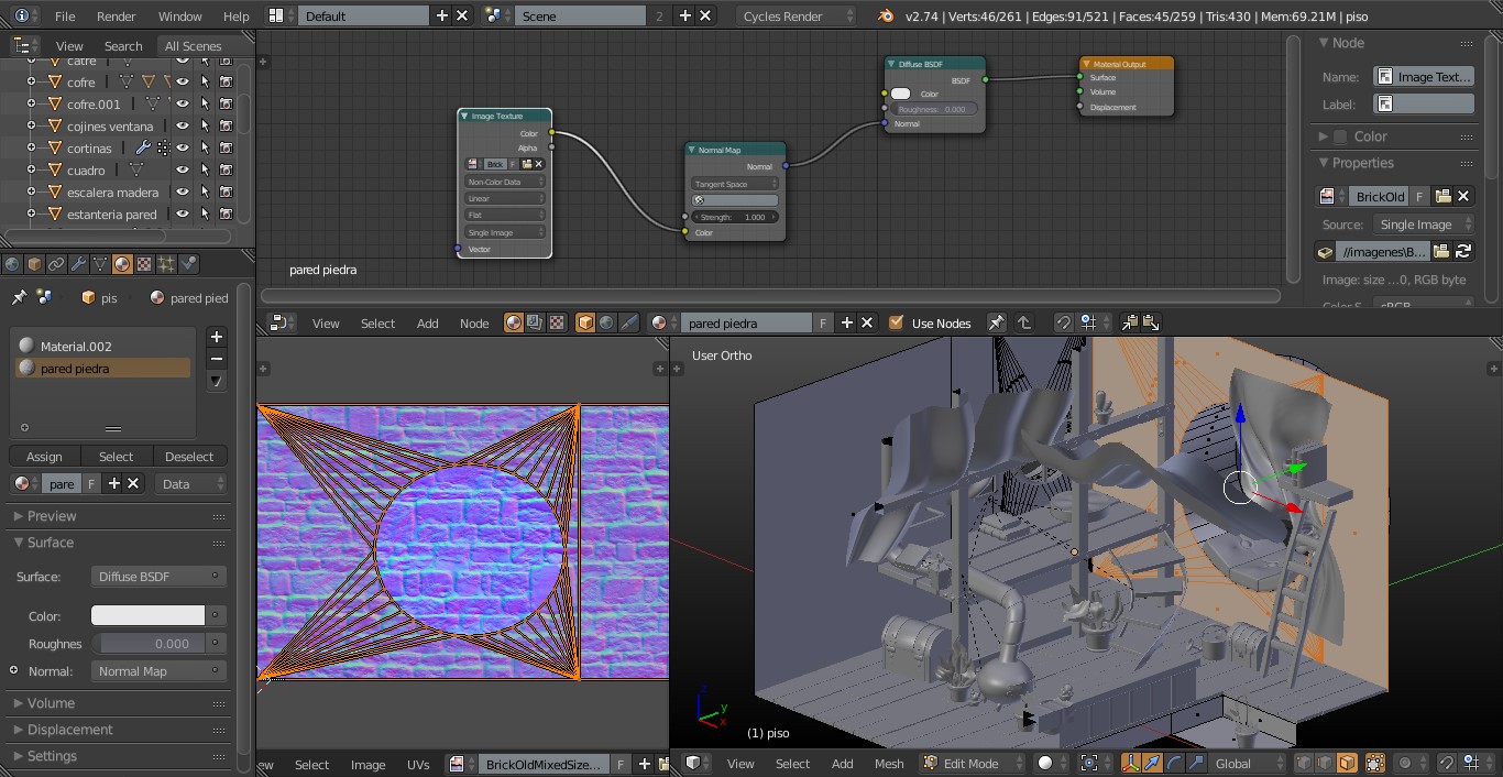 Hay que reconocer lo bien que quedan los bumps, y lo necesarios que son para no tener que modelar nada. Pille una imagen de http://www.cgtextures.com/, la hice repetible (por si hubiese sido necesario) en el Gimp y le saque el mapa de normales. Pongo los nodos en la imagen de arriba. Saludos.