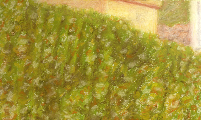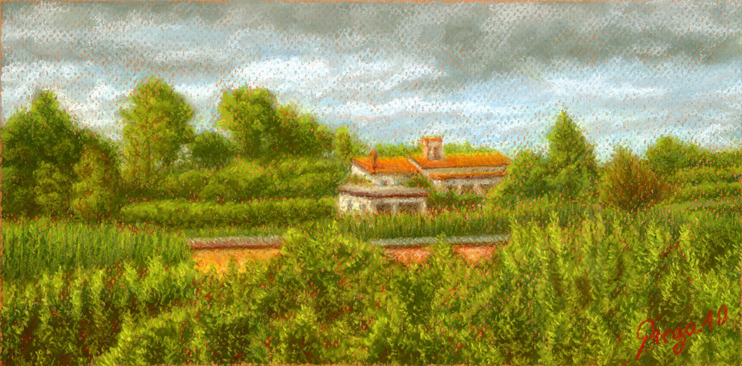 Al escanear la imagen realmente ha quedado algo más sucia y he tenido que ajustar los colores en Adobe Photoshop, la casa blanca de arriba se me ha quemado un poco y hay una especie de surco vertical en el seto, por dónde uní la obra, la escaneé en dos partes porque no cabía claro, en fin, imaginaros el retrato auténtico.