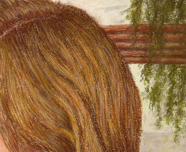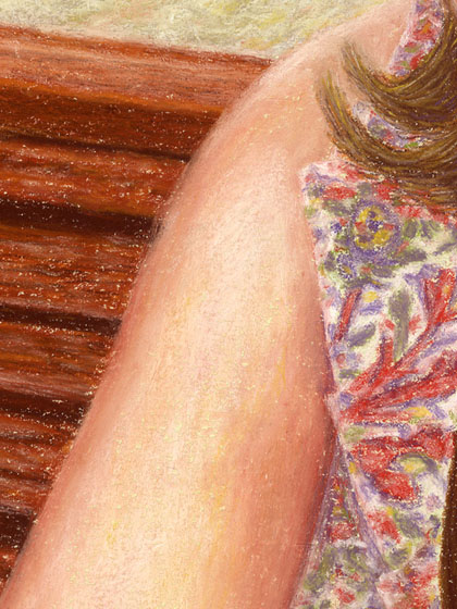 Subo estos detalles a tamaño algo más grande que el real para que veáis los Trazos, en ningún caso he difuminado con los dedos, todo está trabajado a base de arrastrar las barras por el papel.