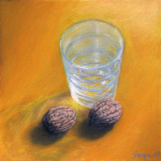 Las nueces increíbles, el vaso no me mola tanto, pero yo creo que es más por la técnica que usas que por el dibujo, la textura esa rugosilla le va muy bien a las nueces, pero el vaso yo lo hubiese difuminado.