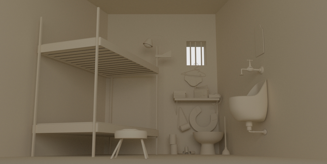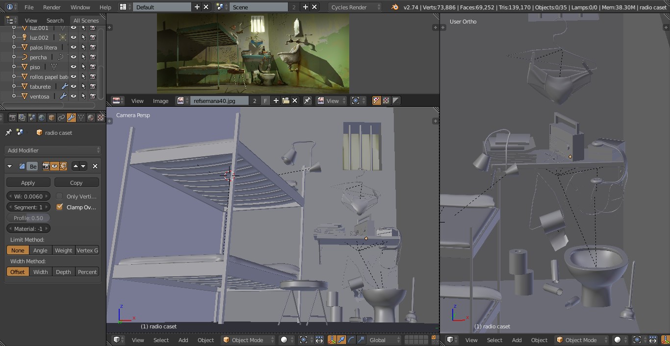 Te vas metiendo también en los escenarios (con lo complicado que es organizar todos los elementos de la escena) y te vas superando. No sé cómo has hecho la tapa del inodoro, pero podrías hacerla fácilmente con una curva Bézier y los agujeros (creo que los tiene) seria añadir más curvas Bézier y automáticamente te hace los agujeros.