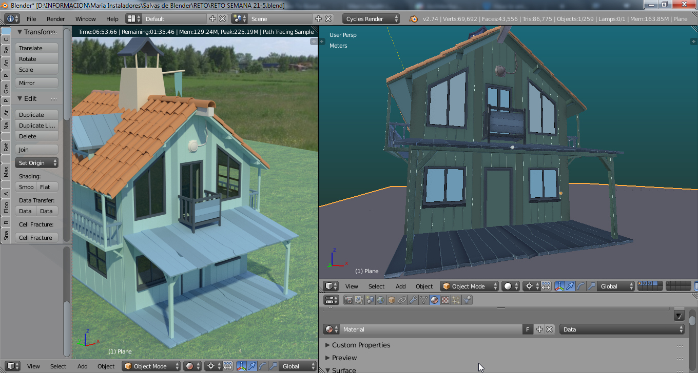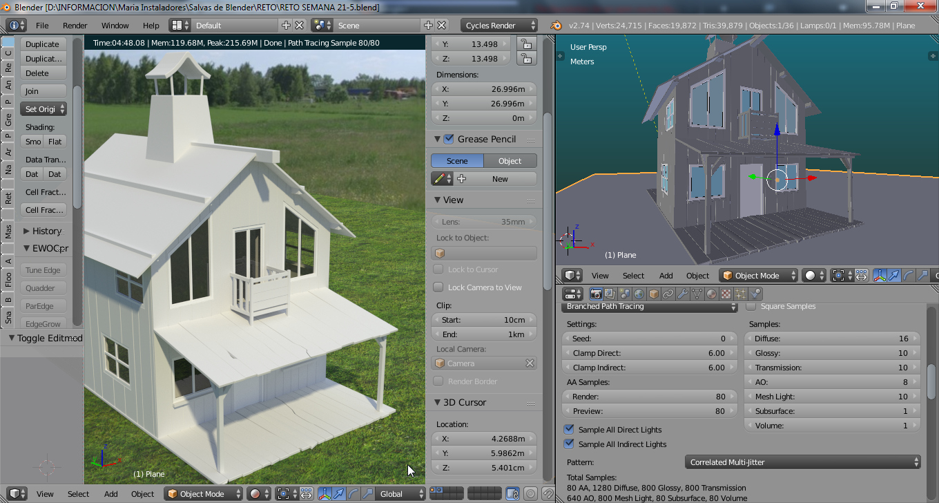 Terminado el reto 41. La he dejado en 200 samples. Le puse 2000 pero me pedía demasiado tiempo, y por calentamiento se me apagaba el portátil cada poco. A si que ahí la he dejado. Le he puesto un par de sistemas de partículas para la hierba. Me ha quedado bastante bien.