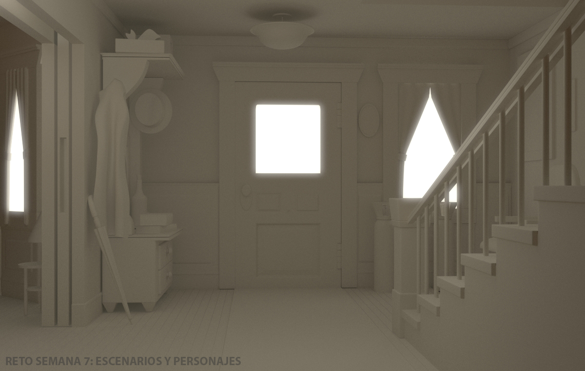 Yo también ajusto la cámara a mano, como oiranac, pero siempre es recomendable conocer el funcionamiento de add-ons y otras herramientas que puedan sacarnos de un apuro. Aquí dejo la versión final del reto 7. No me preocupé de modelar lo que se ve en la habitación de al lado, a la izquierda, pero supongo que, lo importante era completar la habitación principal. Un saludo.