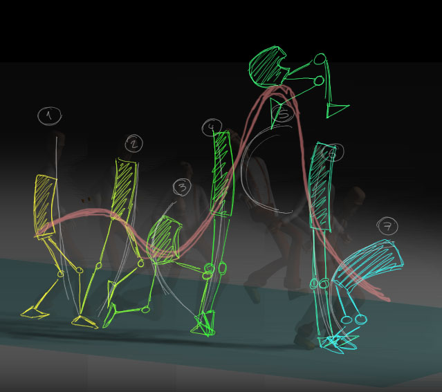 Al igual que Ernesto, lo primero que hago es actuar mi escena en video referencia hasta que consigo algo con lo que me siento cómodo. De ahí suelo quitar las posturas y las exagero (recordemos que la exageración es algo importante en la animación). El timing es más delicado. Si cogemos el timing del propio video, el resultado es bueno, pero todo depende de lo que queramos contar en nuestra animación. Diferentes tipos de personaje saltaran de diferentes formas.