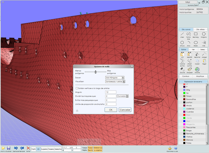 Dije que no iba a poner más imágenes de moi3d, pero aquí va la última. Es una captura de pantalla de la exportación de la malla. Al final sale una cosa bastante decente, eso sí, todo triángulos. La captura que pongo no fue la definitiva -estuve ajustando mejor la malla- Pero la pongo para que se vea que la cosa no es tan desastrosa como cuando puse los primeros intentos (en la primera página, para quien no se haya leído el hilo entero).