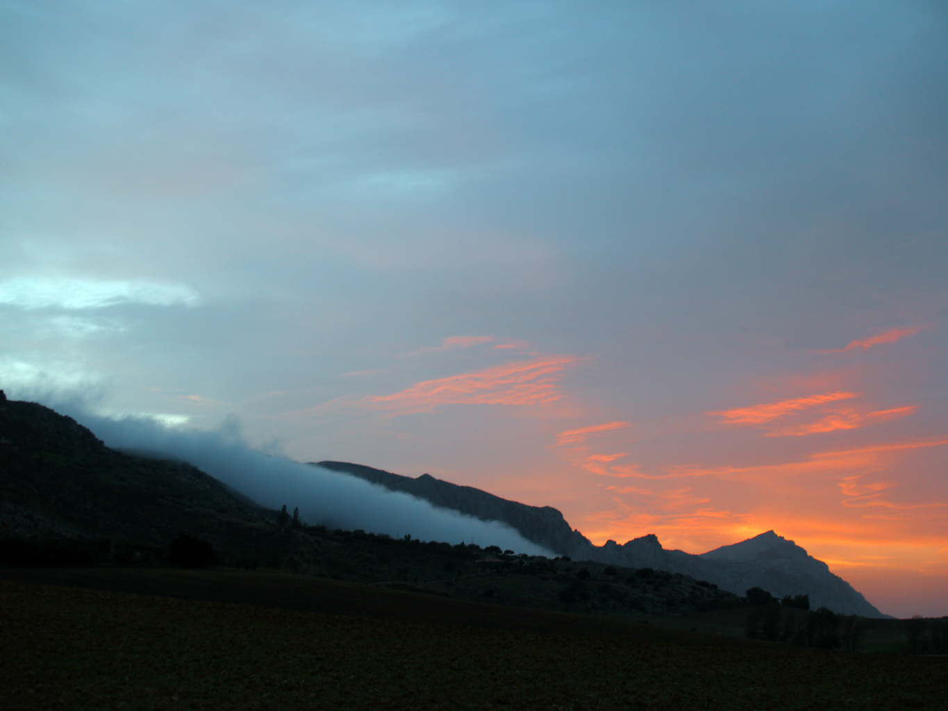 Esa nocturna tuya está muy guapa con las nubes cayendo y con ese tono rosáceo. Me da que con paciencia podrías hacerte una panorámica bastante interesante enlazando varias se echa de menos ver cómo continúa a mano derecha que se queda como cortado por un pelo el monte.