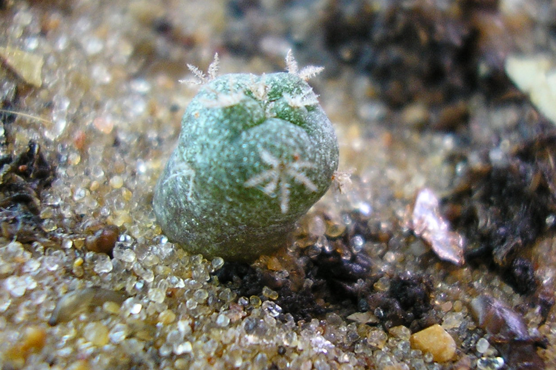 Ésta es una Lophophora Williamsi de siembra propia, macro, salió un poco mal enfocada por que es muy pequeño y me cuesta.