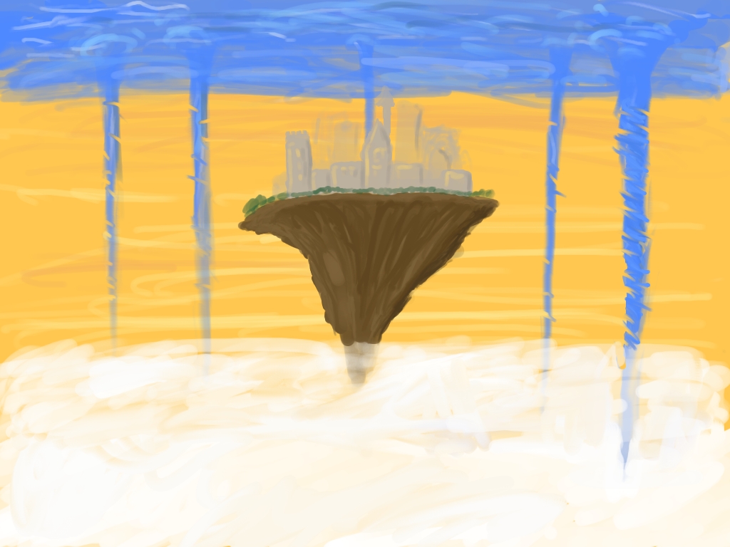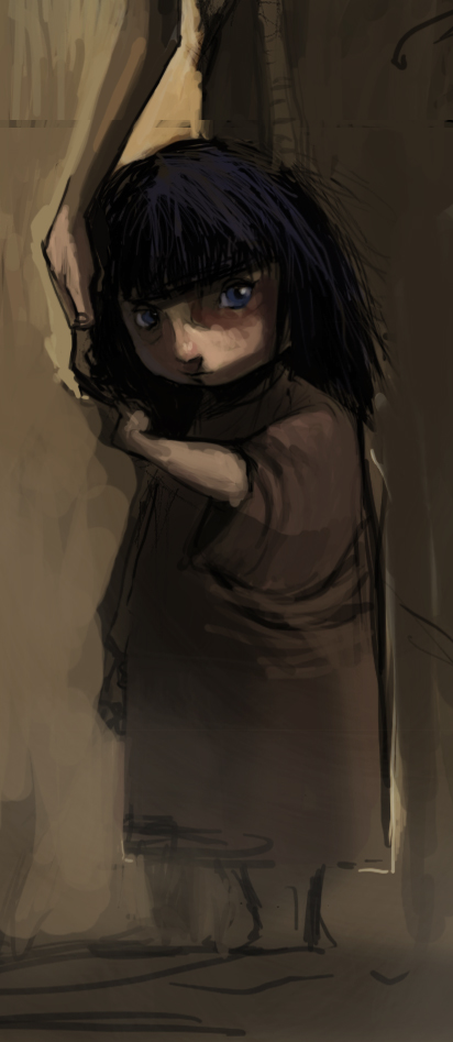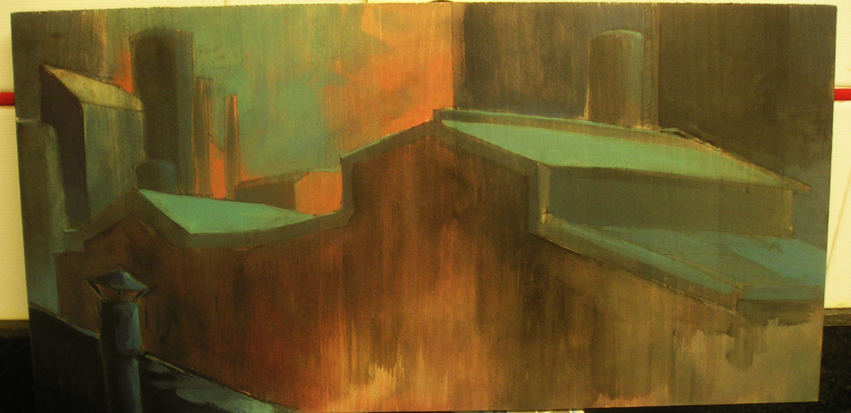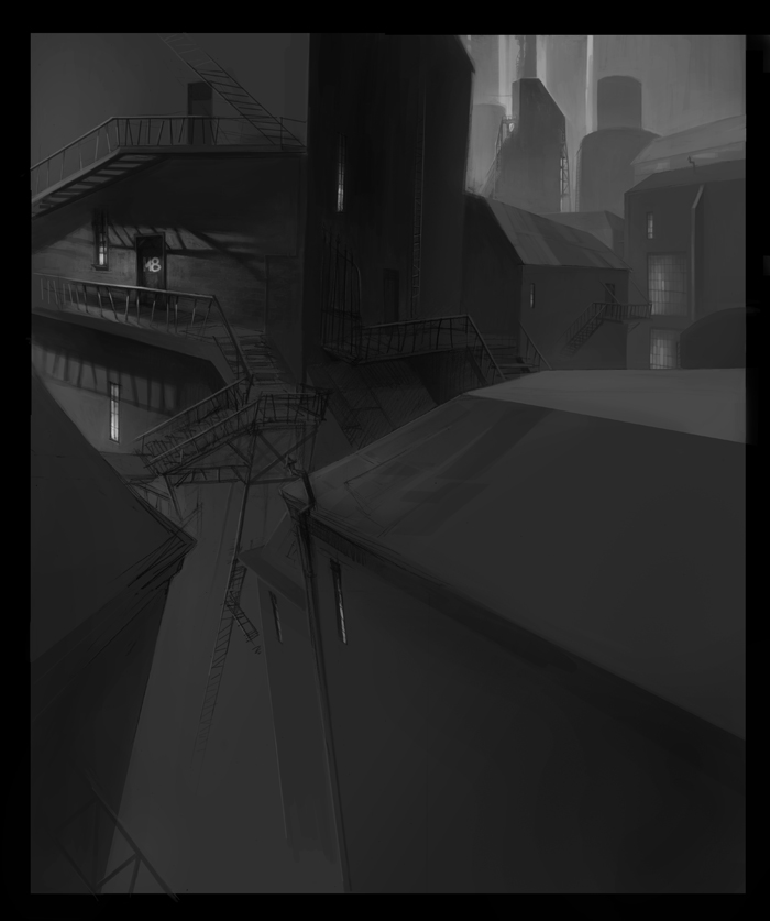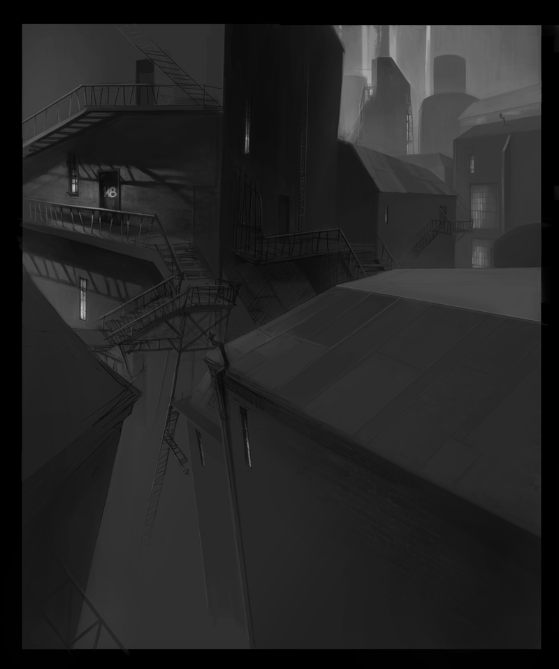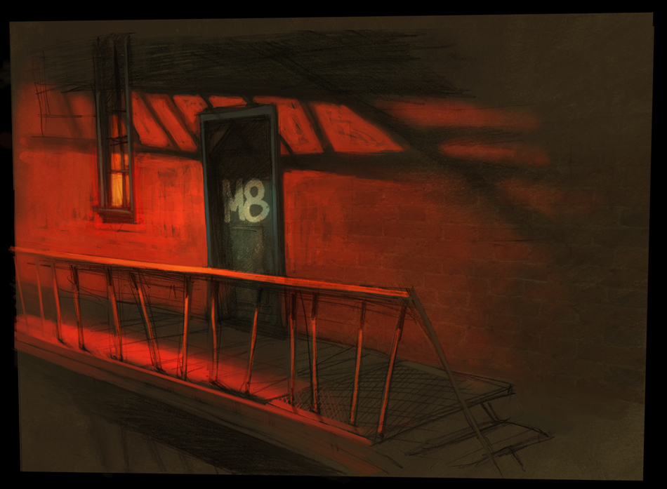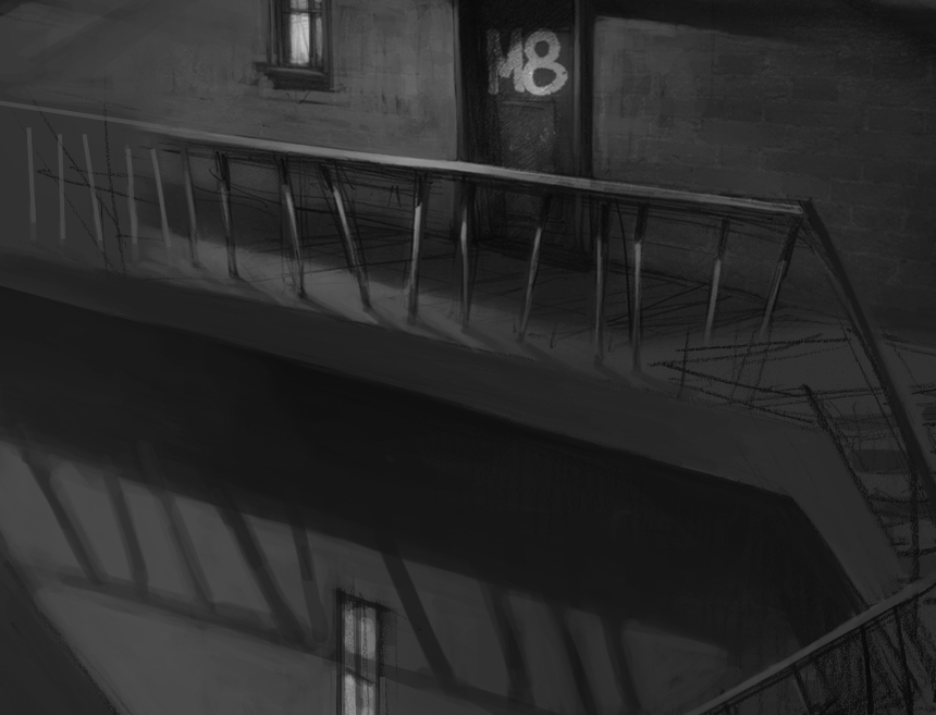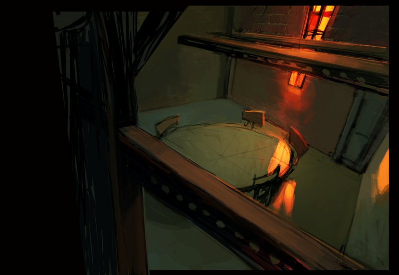 La luz viene desde arriba y proyecta esa sombra abajo, creo que eso no está mal, pero a fuerza de mirarlo arriba si hay un fallo bastante bestia, pero creo que lo dejaré así, si me pusiera en plan técnico corregiría la perspectiva también(empezando por ahí.)y las sombras deben estar mal todas, o casi todas, ya que está bastante ficcionado todo, intentando que prime la intención estética para crear una sensación. Gracias de todos modos, pero, sigo sin entender que le pasa a esa parte lo siento, a veces soy un poco negado.