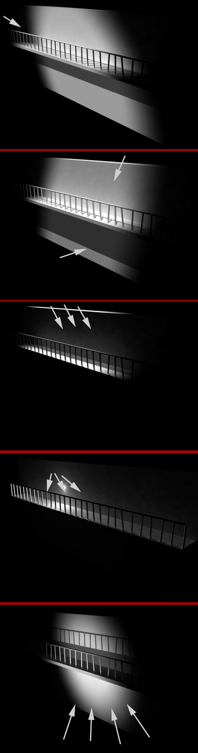 La sombra de la barandilla no se dibujara nunca sobre la pared, porque la tapa el suelo de la pasarela. La luz, para que la pasarela arroje sombra a la pared por debajo, tiene que venir desde arriba.