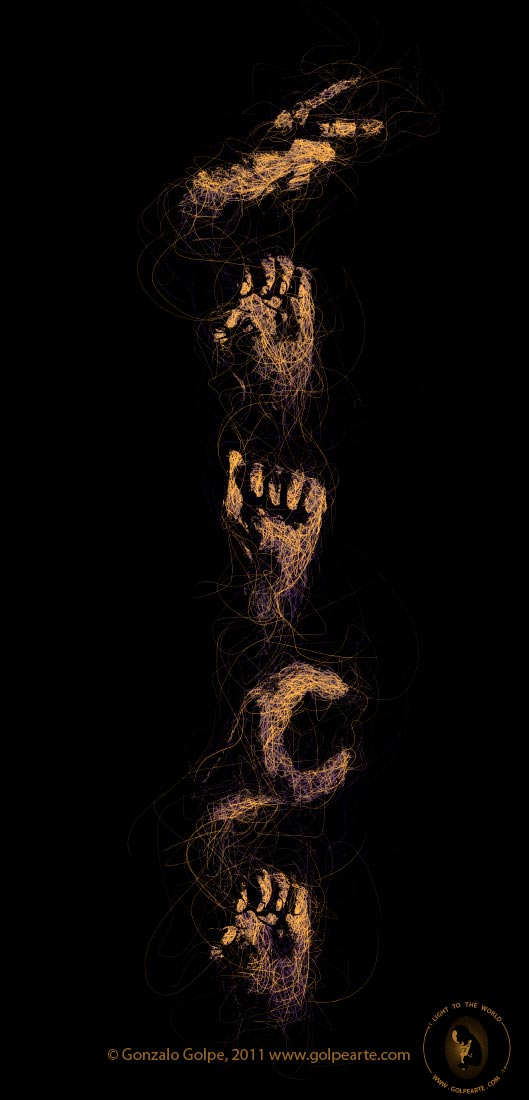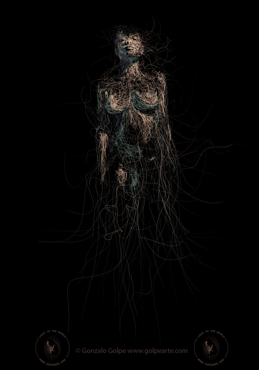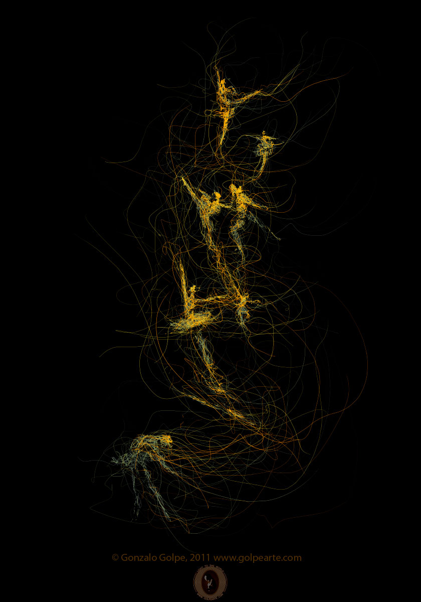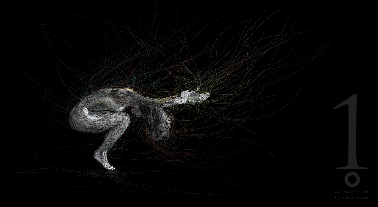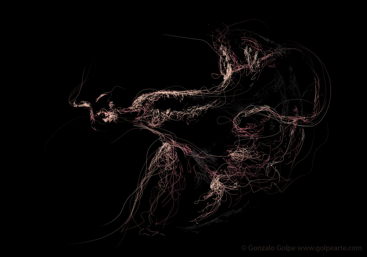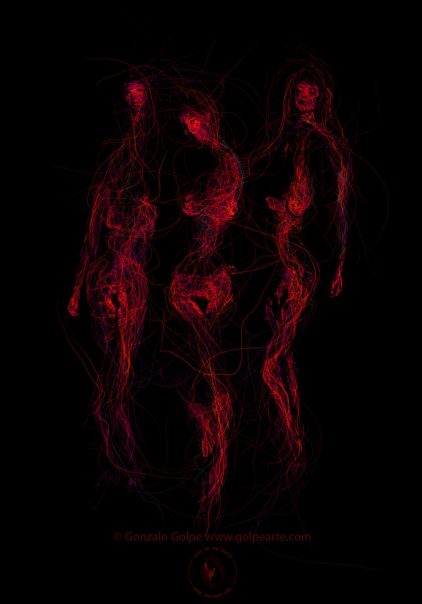 Con respecto a estos trabajos (ahora me refiero a los que hago), creo que no lo había comentado, está la idea de la conexión, comunicación con todos y todo. El primer trabajo que hice de este tipo fue una escultura conceptual hace, creo que 12 o 13 años, donde las partes de un cuerpo estaban esparcidas por el suelo y unidas todas como por un cable ondulante. Luego hice una obra en un lienzo donde una bailarina echa por líneas bailaba en un escenario de fondo negro. Y luego otras obras más y después, en 2003, fue cuando comencé a pintar con el ordenador. Es curioso cómo lo que haces ahora y te sientes cómodo es como si ya lo hubieses hecho siempre, por decirlo de alguna forma.