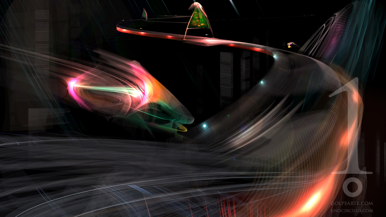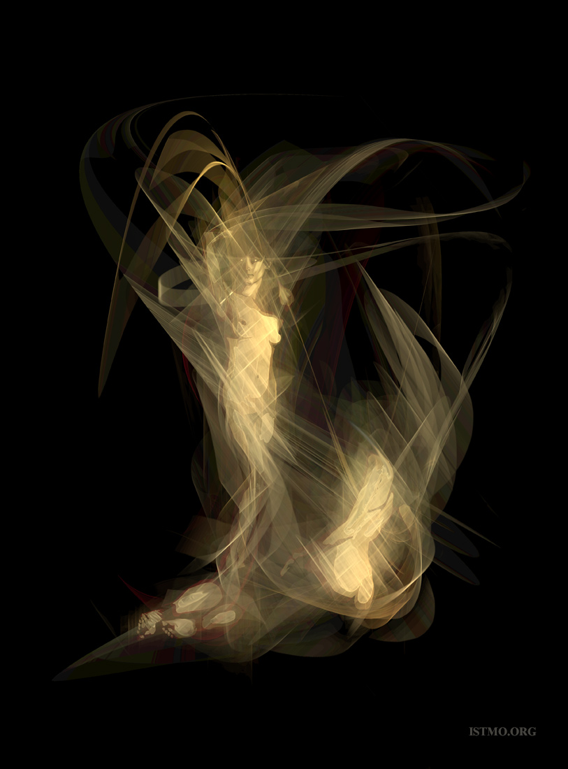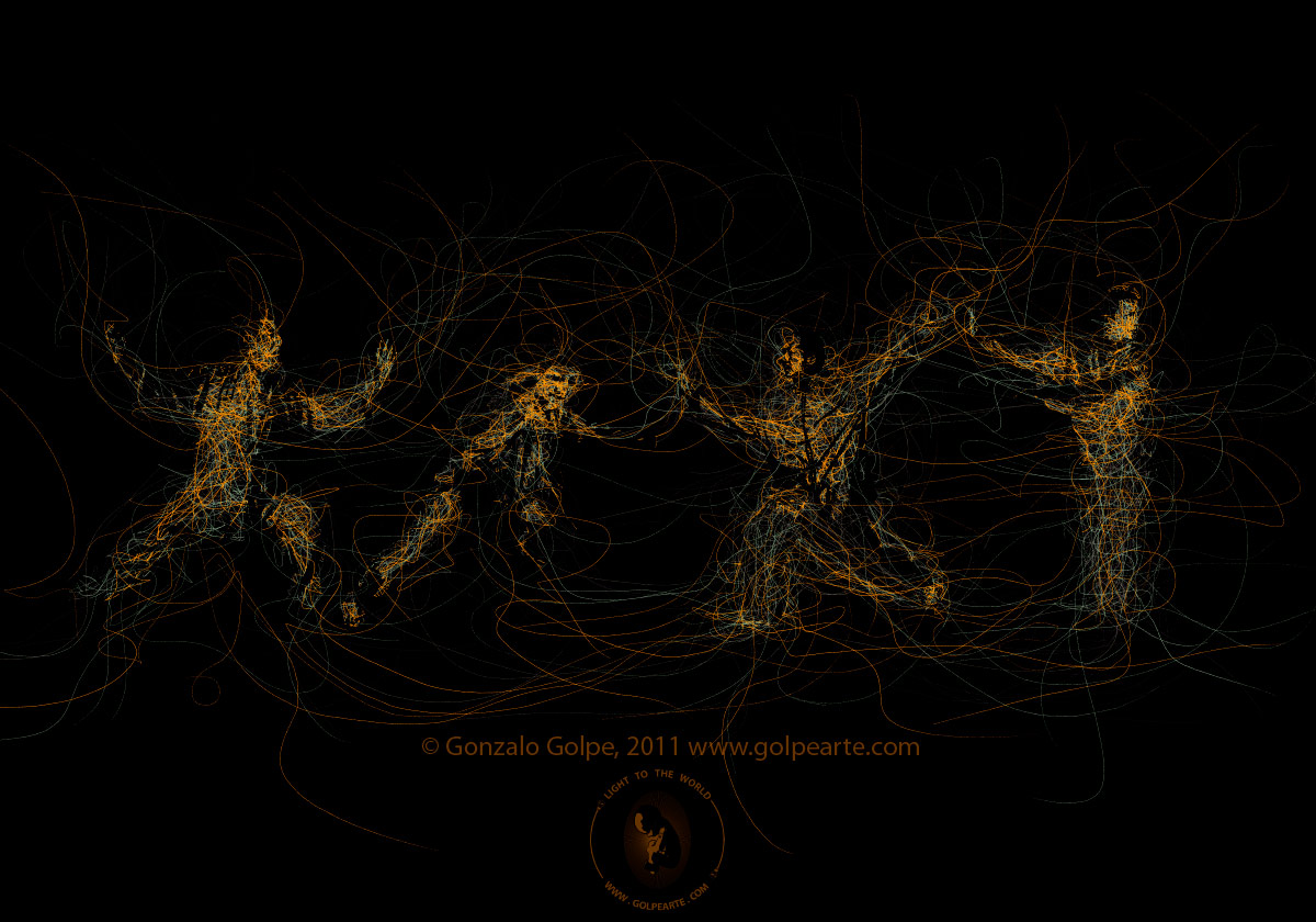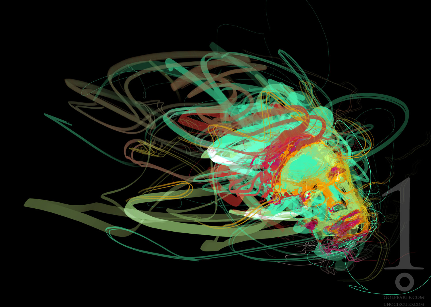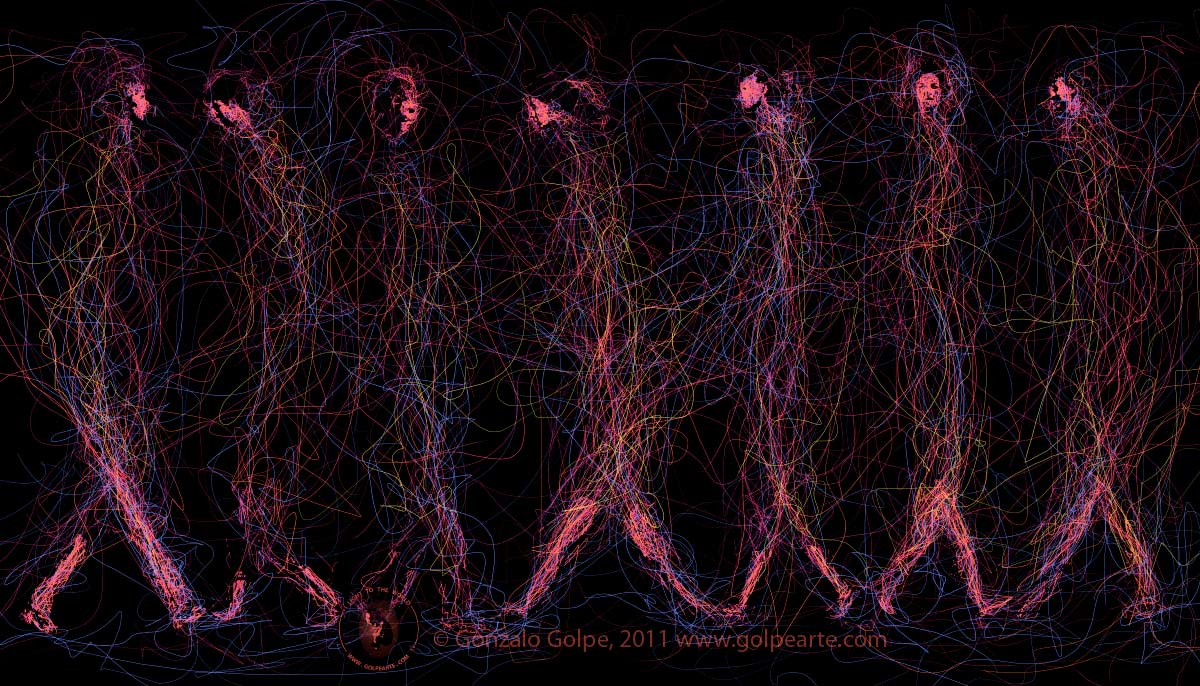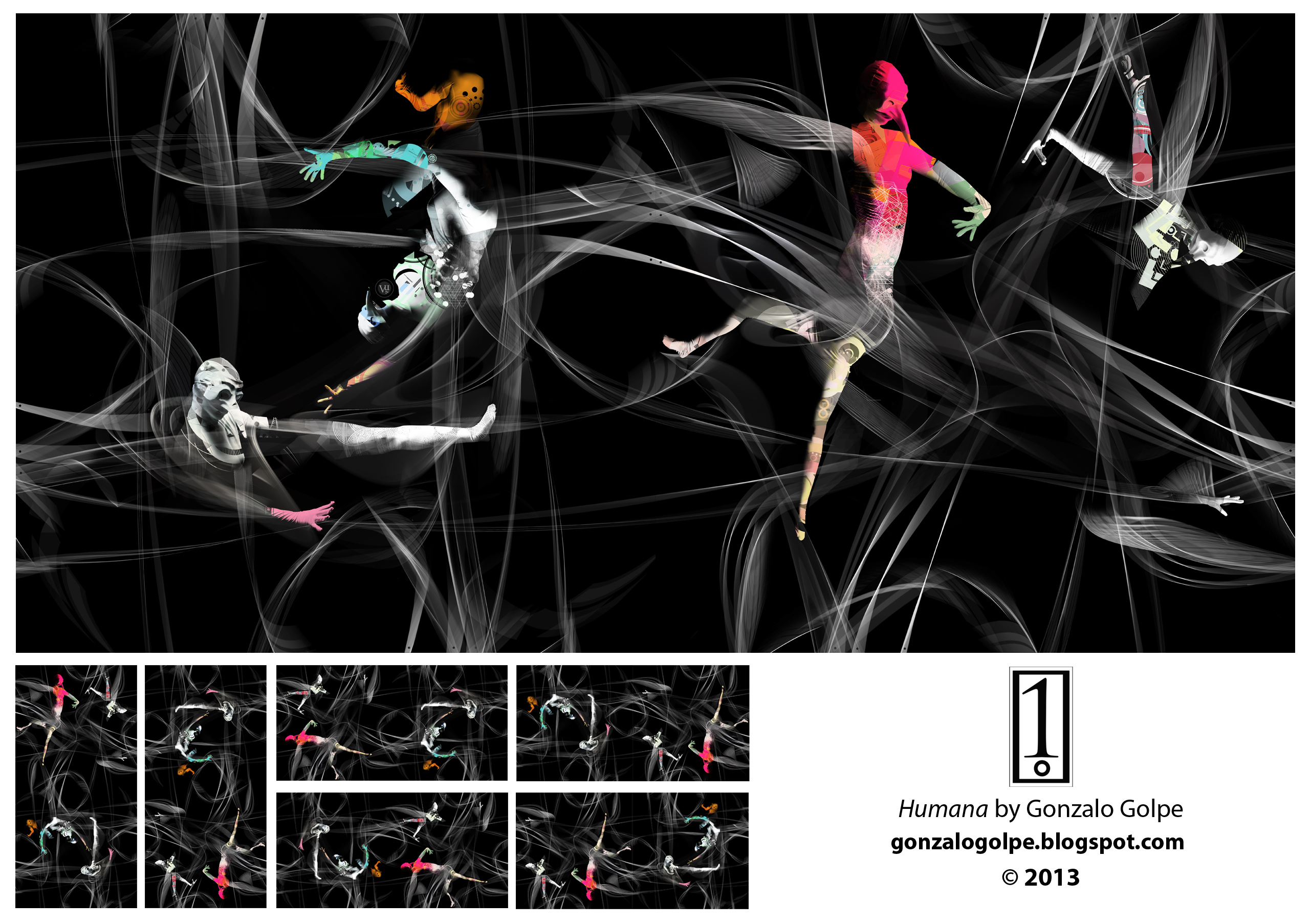 Con respecto a estos trabajos (ahora me refiero a los que hago), creo que no lo había comentado, está la idea de la conexión, comunicación con todos y todo. El primer trabajo que hice de este tipo fue una escultura conceptual hace, creo que 12 o 13 años, donde las partes de un cuerpo estaban esparcidas por el suelo y unidas todas como por un cable ondulante. Luego hice una obra en un lienzo donde una bailarina echa por líneas bailaba en un escenario de fondo negro. Y luego otras obras más y después, en 2003, fue cuando comencé a pintar con el ordenador. Es curioso cómo lo que haces ahora y te sientes cómodo es como si ya lo hubieses hecho siempre, por decirlo de alguna forma.