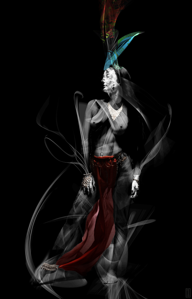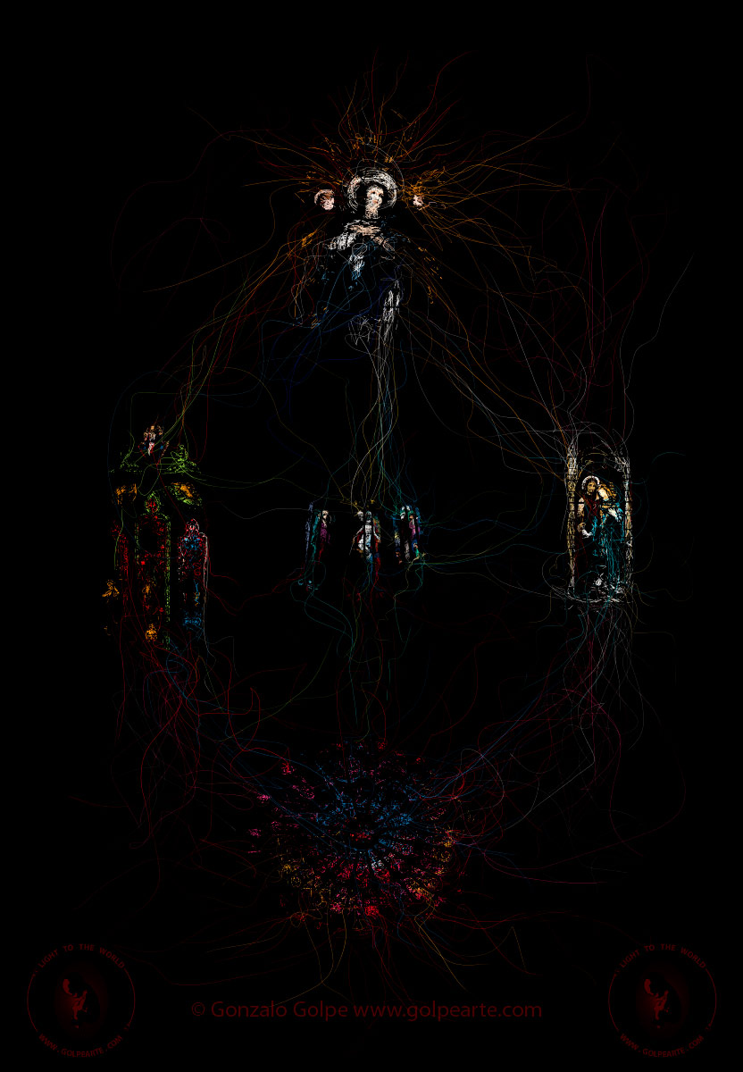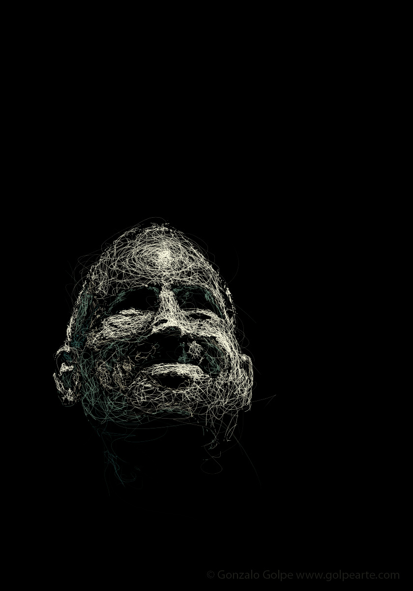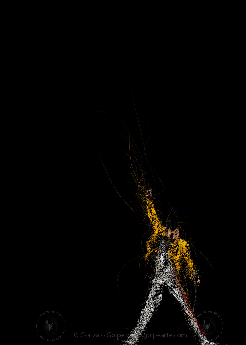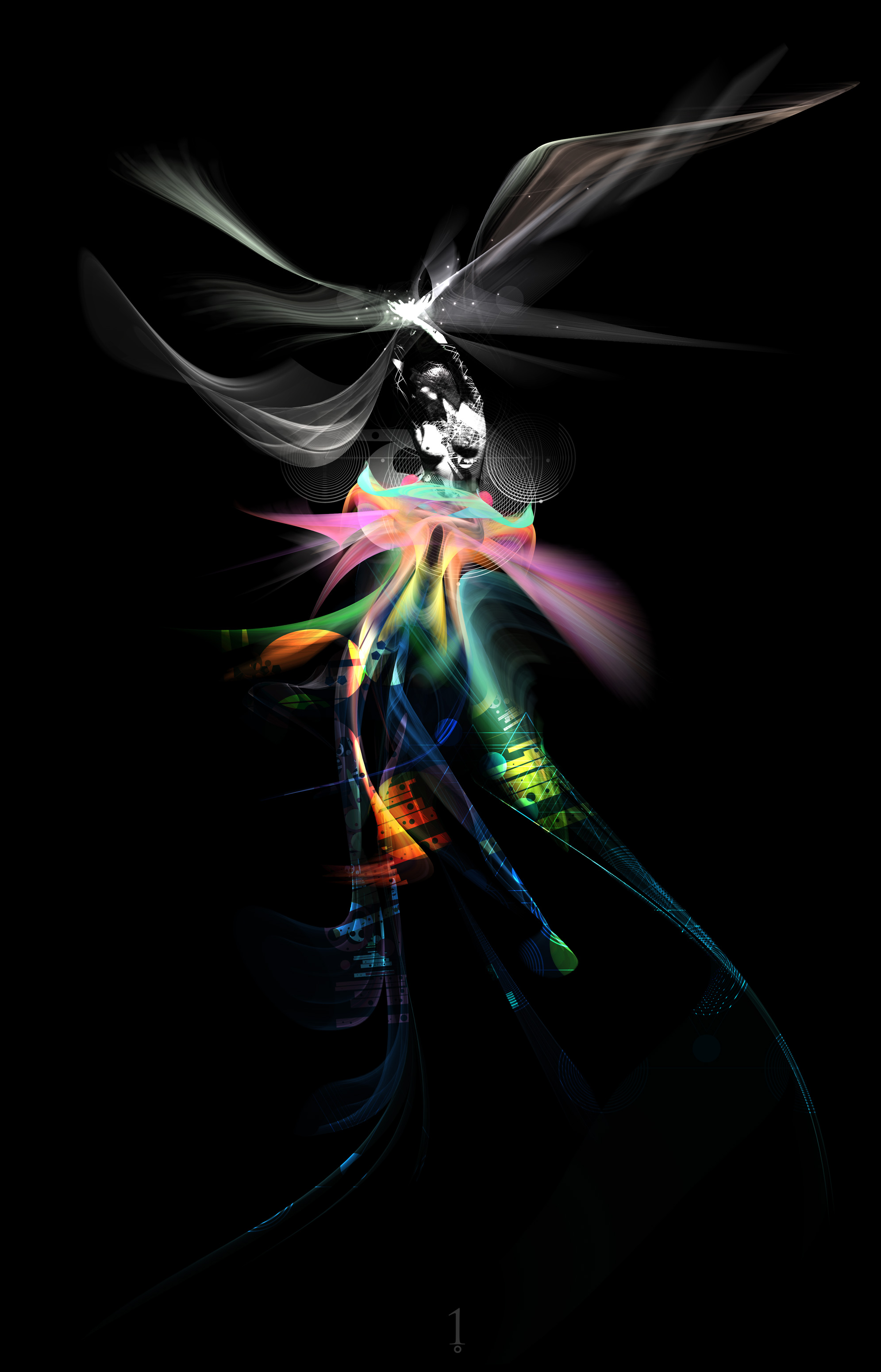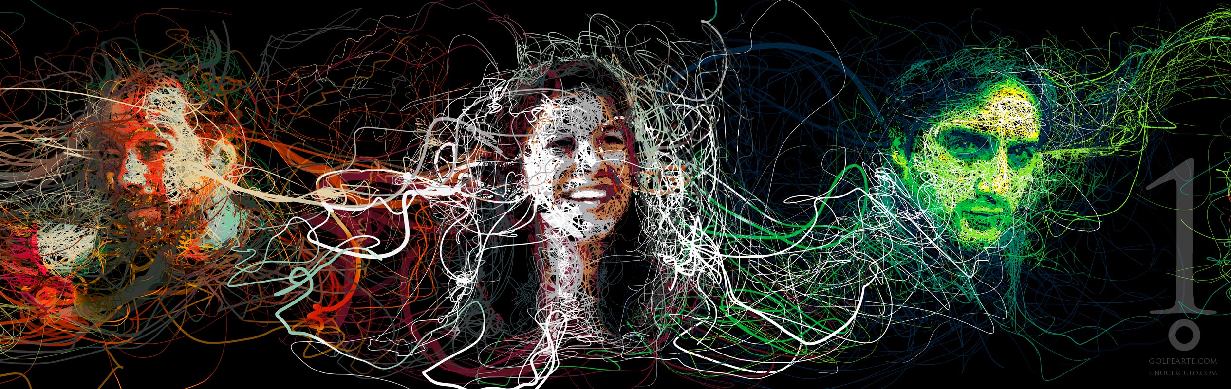 Con respecto a estos trabajos (ahora me refiero a los que hago), creo que no lo había comentado, está la idea de la conexión, comunicación con todos y todo. El primer trabajo que hice de este tipo fue una escultura conceptual hace, creo que 12 o 13 años, donde las partes de un cuerpo estaban esparcidas por el suelo y unidas todas como por un cable ondulante. Luego hice una obra en un lienzo donde una bailarina echa por líneas bailaba en un escenario de fondo negro. Y luego otras obras más y después, en 2003, fue cuando comencé a pintar con el ordenador. Es curioso cómo lo que haces ahora y te sientes cómodo es como si ya lo hubieses hecho siempre, por decirlo de alguna forma.