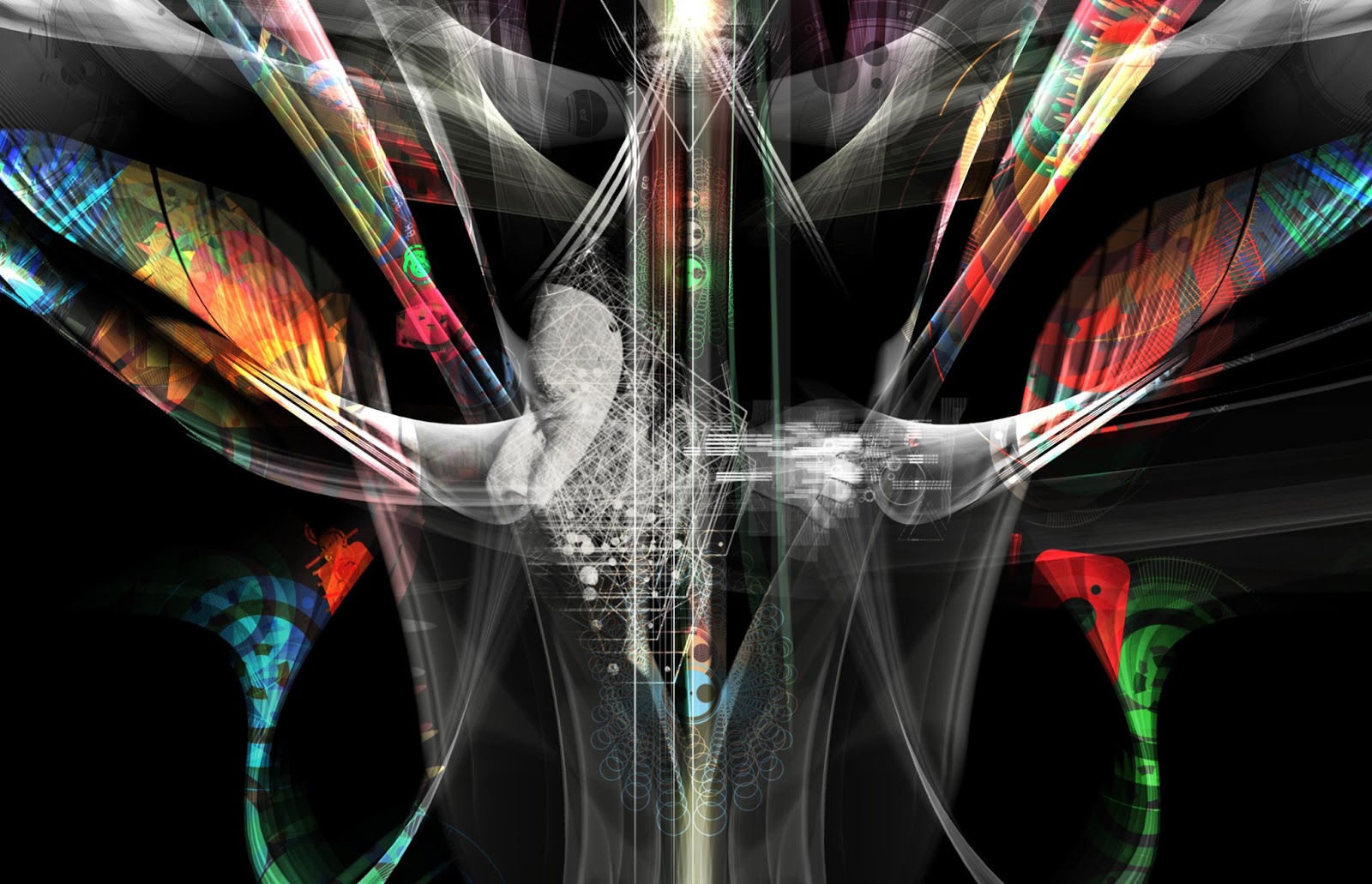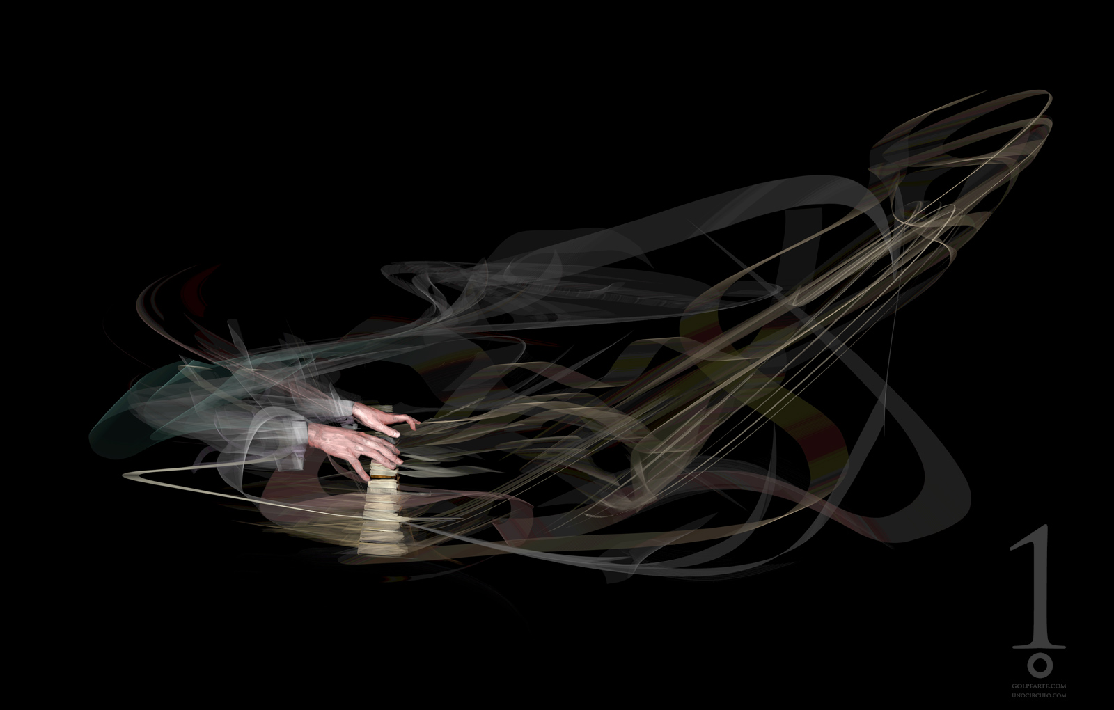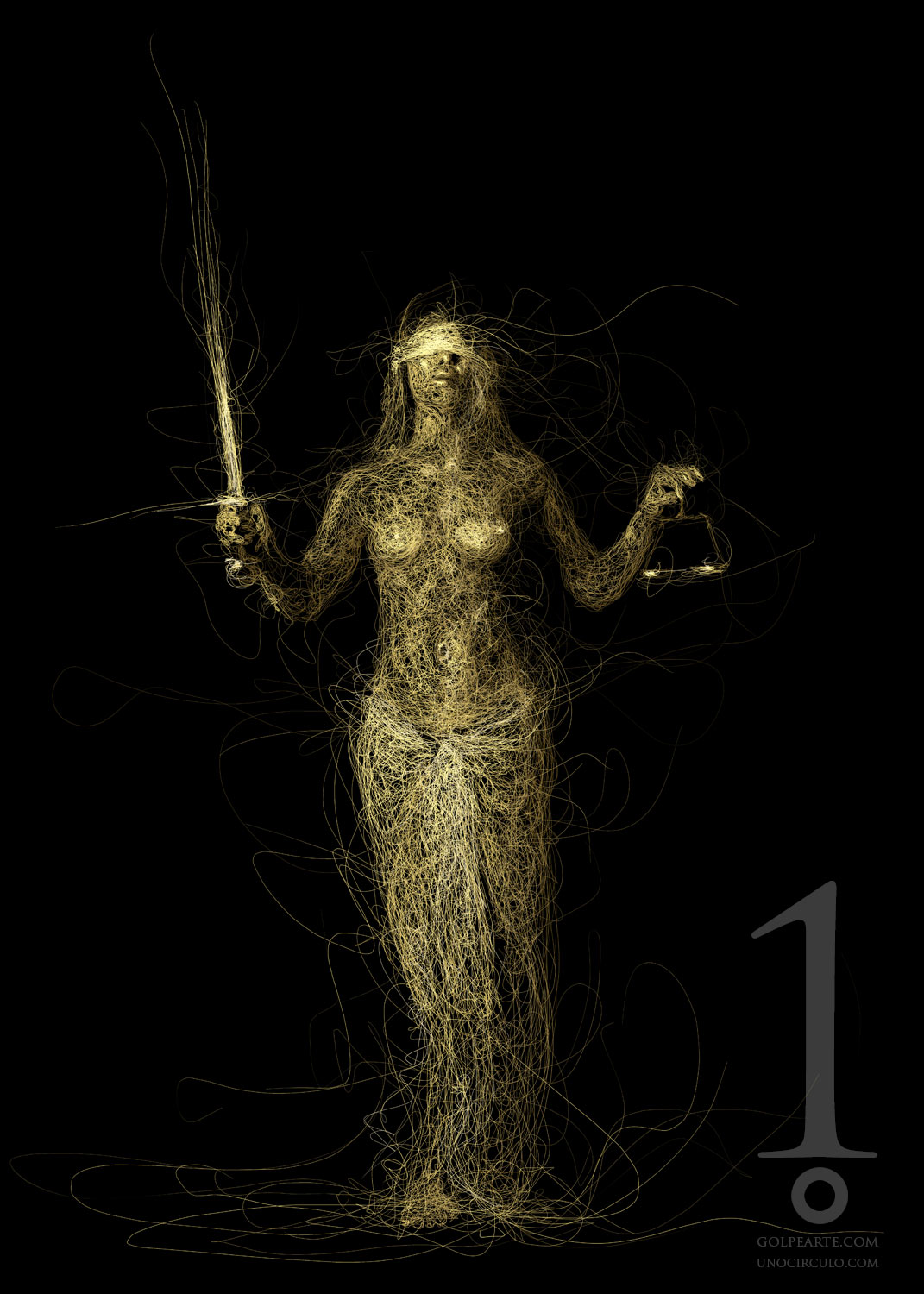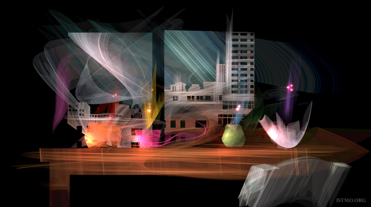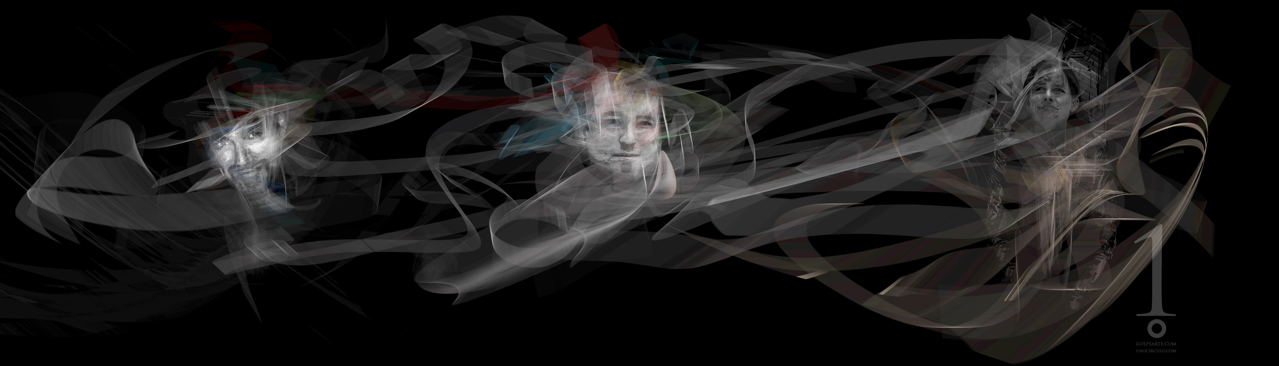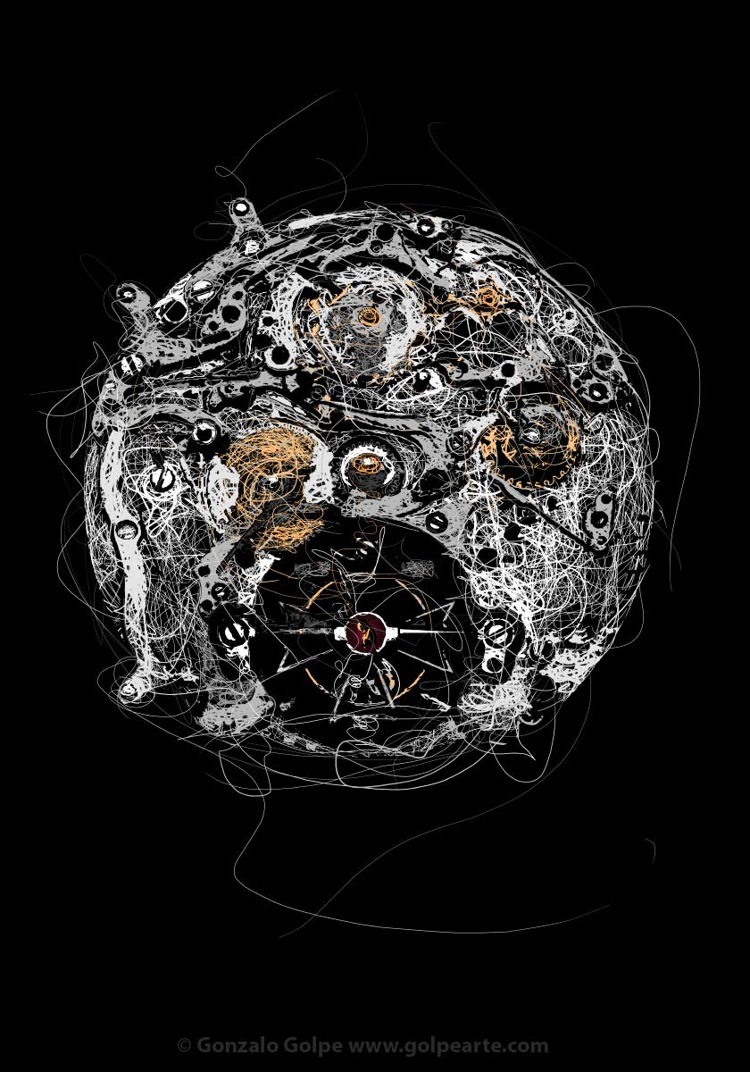 Con respecto a estos trabajos (ahora me refiero a los que hago), creo que no lo había comentado, está la idea de la conexión, comunicación con todos y todo. El primer trabajo que hice de este tipo fue una escultura conceptual hace, creo que 12 o 13 años, donde las partes de un cuerpo estaban esparcidas por el suelo y unidas todas como por un cable ondulante. Luego hice una obra en un lienzo donde una bailarina echa por líneas bailaba en un escenario de fondo negro. Y luego otras obras más y después, en 2003, fue cuando comencé a pintar con el ordenador. Es curioso cómo lo que haces ahora y te sientes cómodo es como si ya lo hubieses hecho siempre, por decirlo de alguna forma.