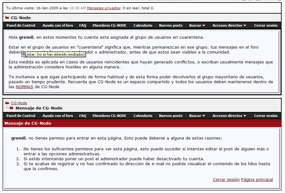 Yo me di de baja en el foro. Yo cuando se hizo lo del tema del cierre del foro y tal, seguí por CG-node intentando hacer como si nada hubiese pasado, el foro creo que tiene buenos contenidos, se publican buenos trabajos y tal, pero ya veo que la cosa no cambia y así pues no hay ganas de publicar, ni mostrar trabajos ni nada.Por cierto, sabes que te puede caer Gremil por la denuncia?Cita: