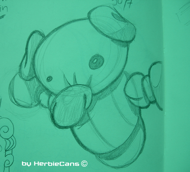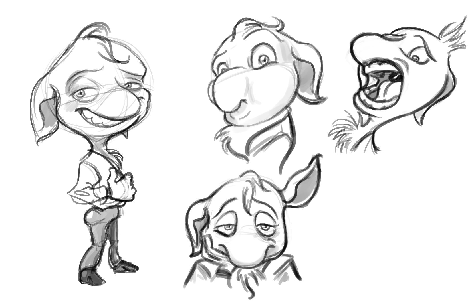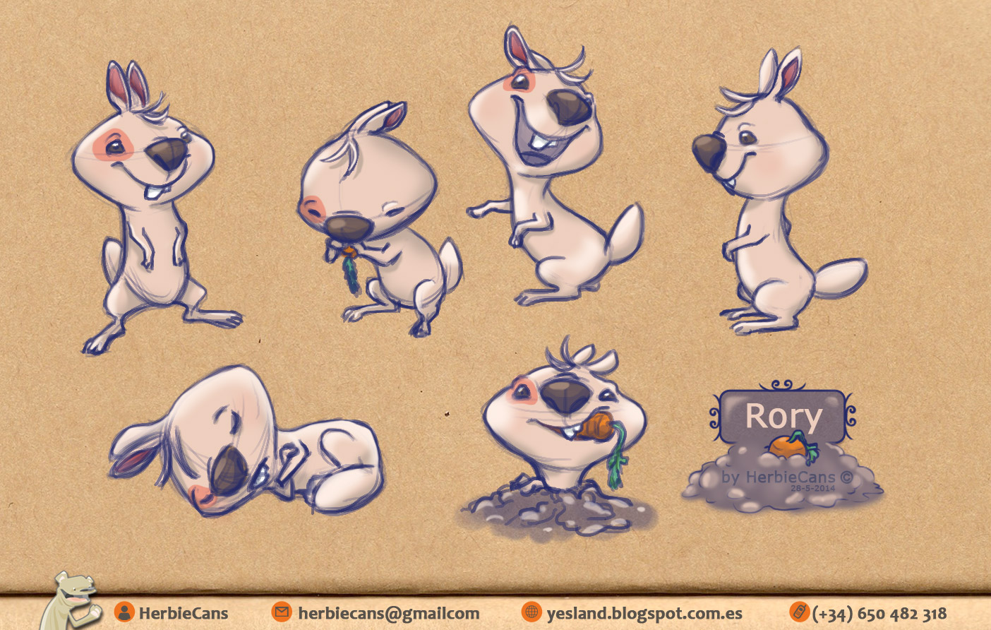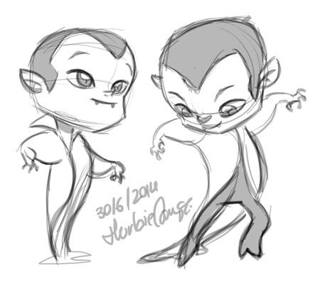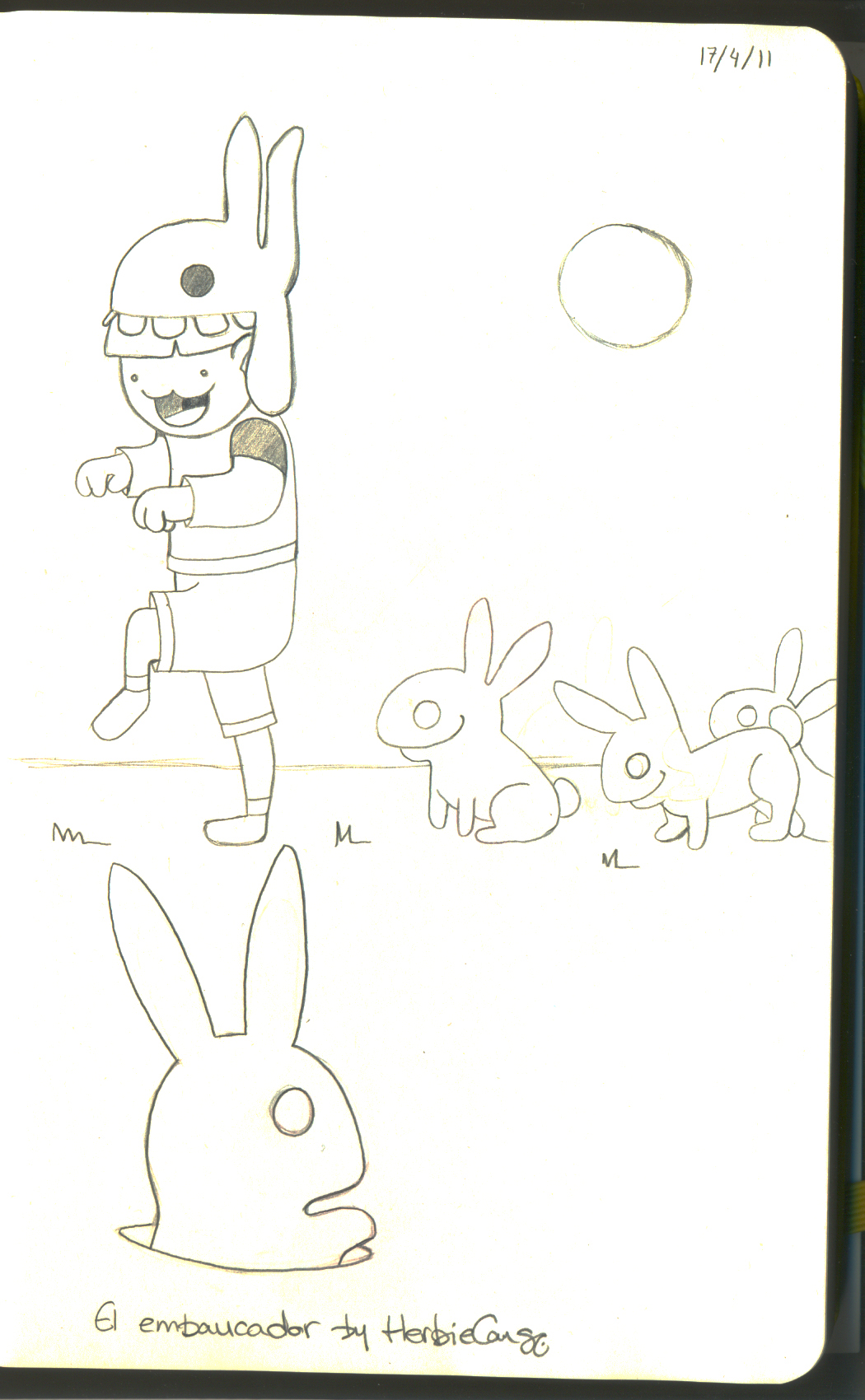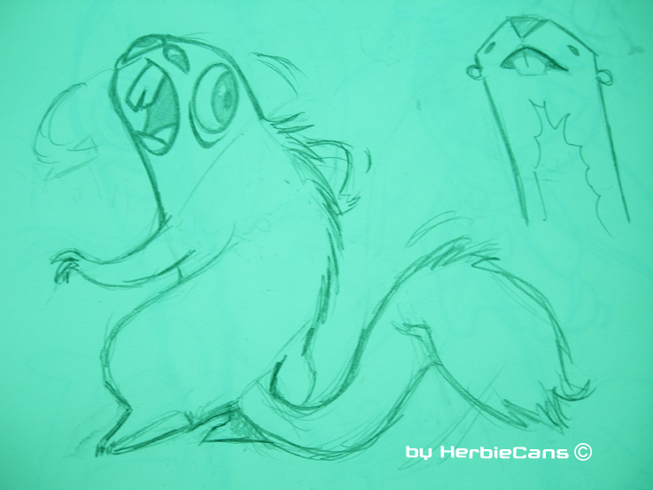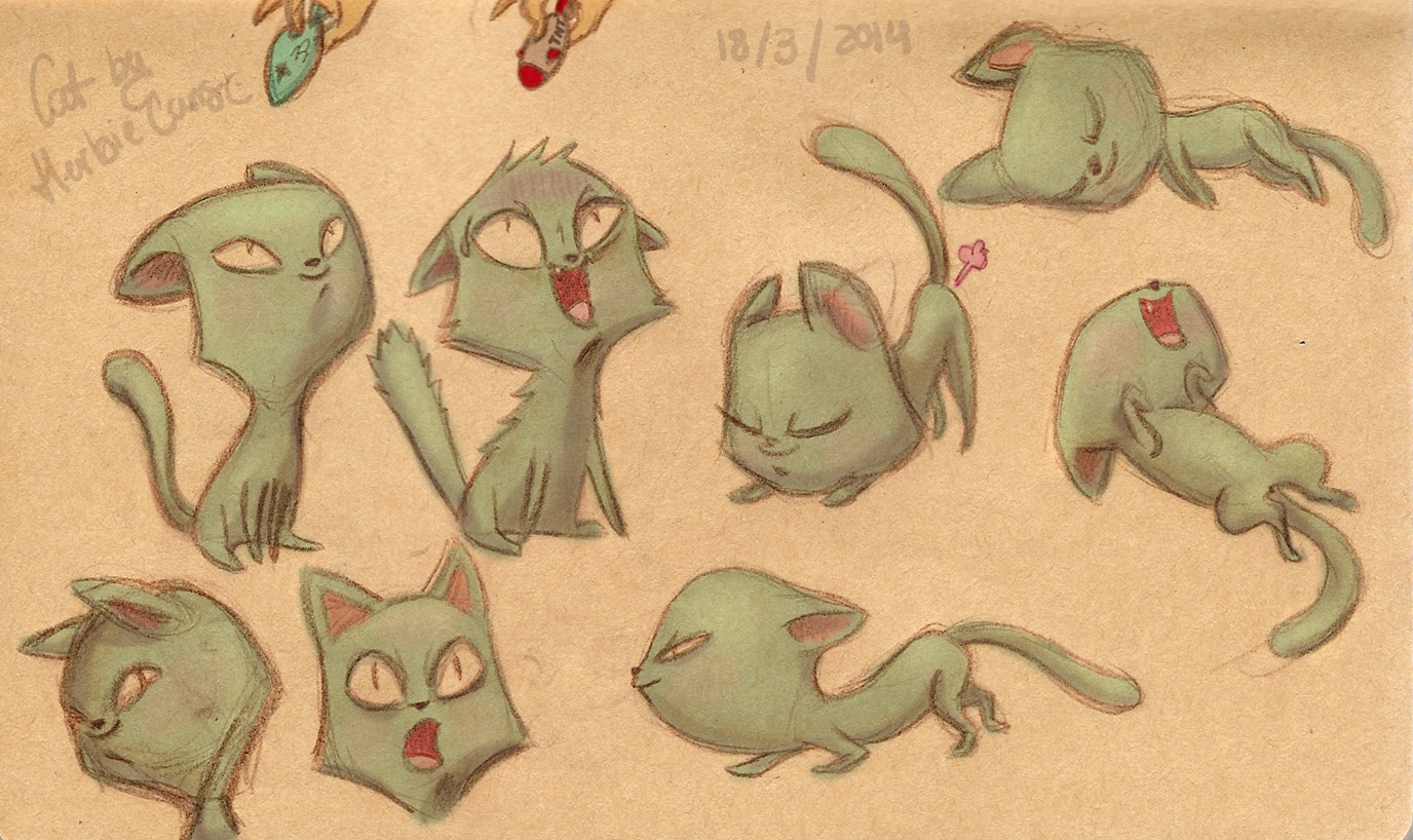 Ya que estoy, voy a subir un personaje que hice ayer. ¿Les parece que en limpio ha perdido? El boceto es más sencillo y he traducido algunas formas de manera diferente en el limpio. Por ejemplo, la pose inferior central en el boceto tiene los ojos simplemente redondos y las orejas hacia arriba. En el limpio, le metí un squash a los ojos y puse las orejas hacia abajo para favorecer la expresión, pero no sé, la sencillez del boceto le da un toque ingenuo que me llama más.