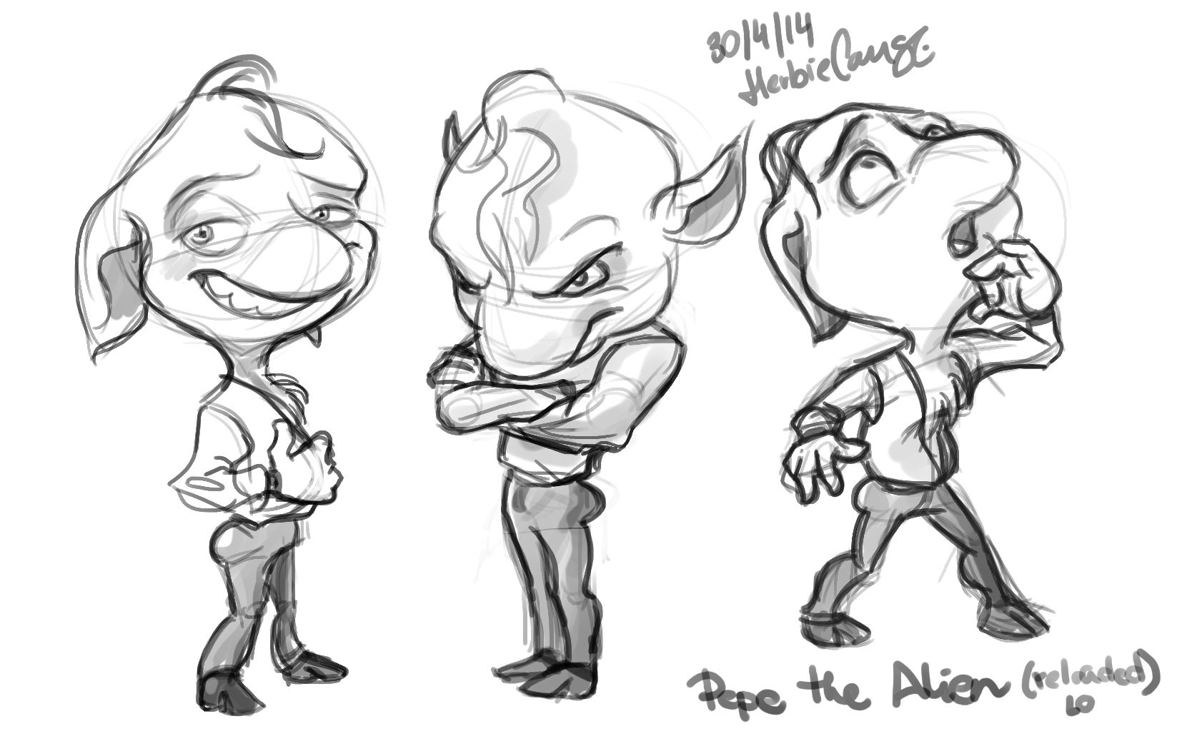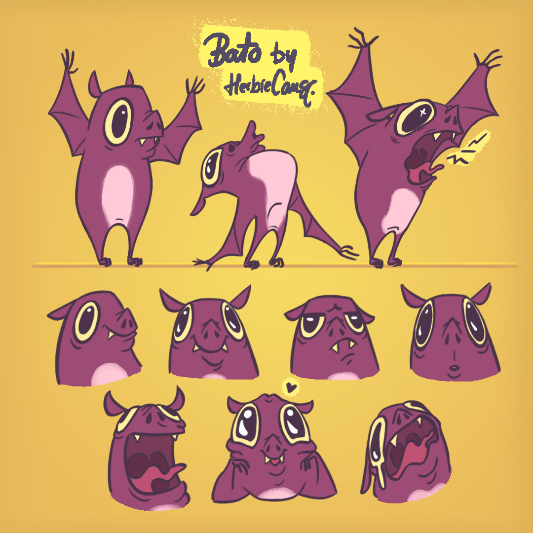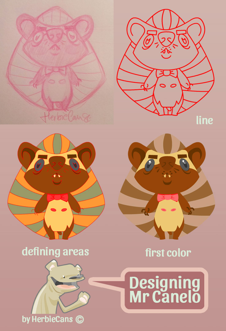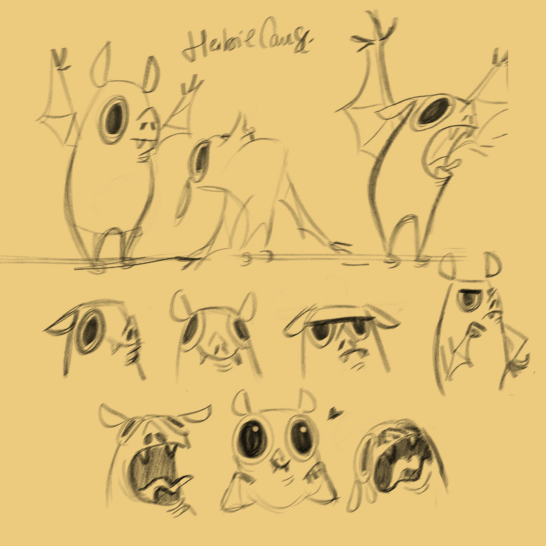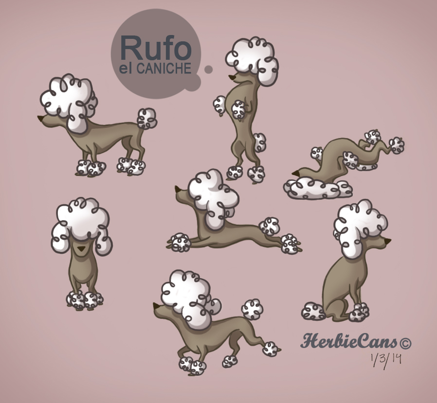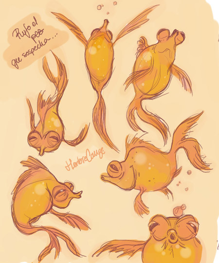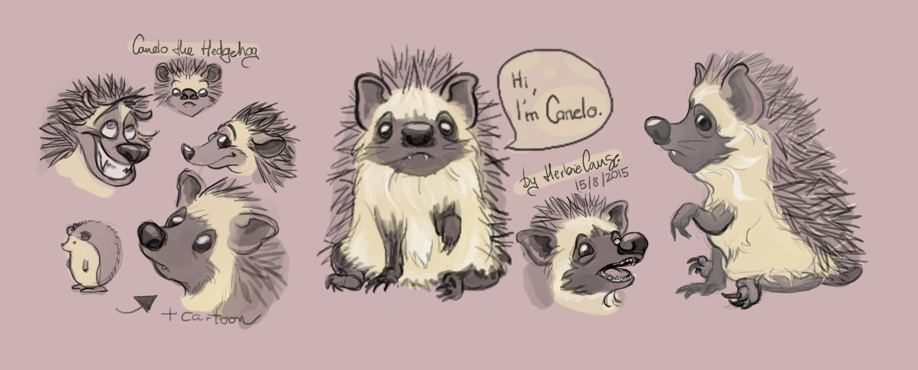 Ya que estoy, voy a subir un personaje que hice ayer. ¿Les parece que en limpio ha perdido? El boceto es más sencillo y he traducido algunas formas de manera diferente en el limpio. Por ejemplo, la pose inferior central en el boceto tiene los ojos simplemente redondos y las orejas hacia arriba. En el limpio, le metí un squash a los ojos y puse las orejas hacia abajo para favorecer la expresión, pero no sé, la sencillez del boceto le da un toque ingenuo que me llama más.