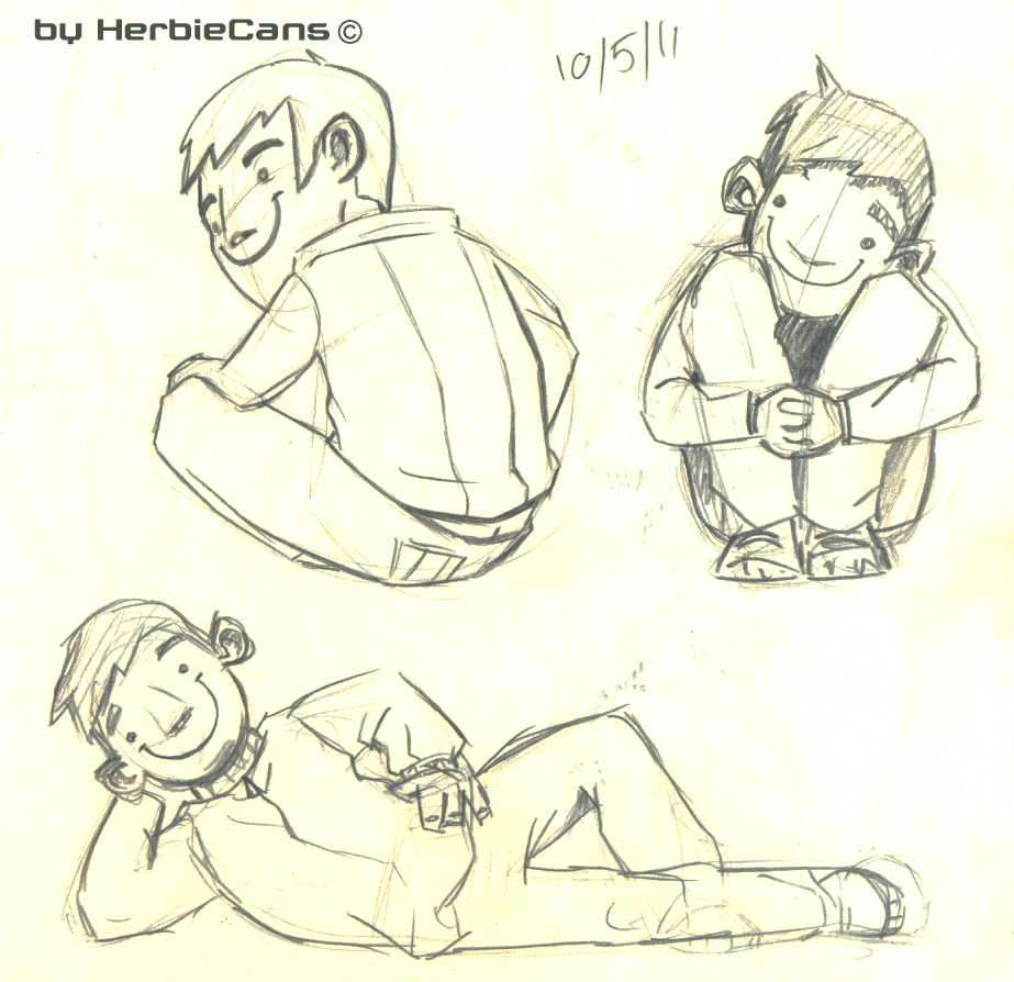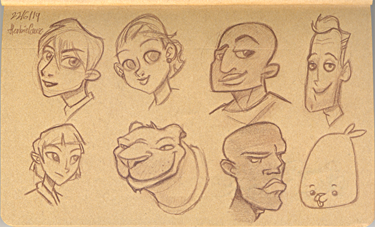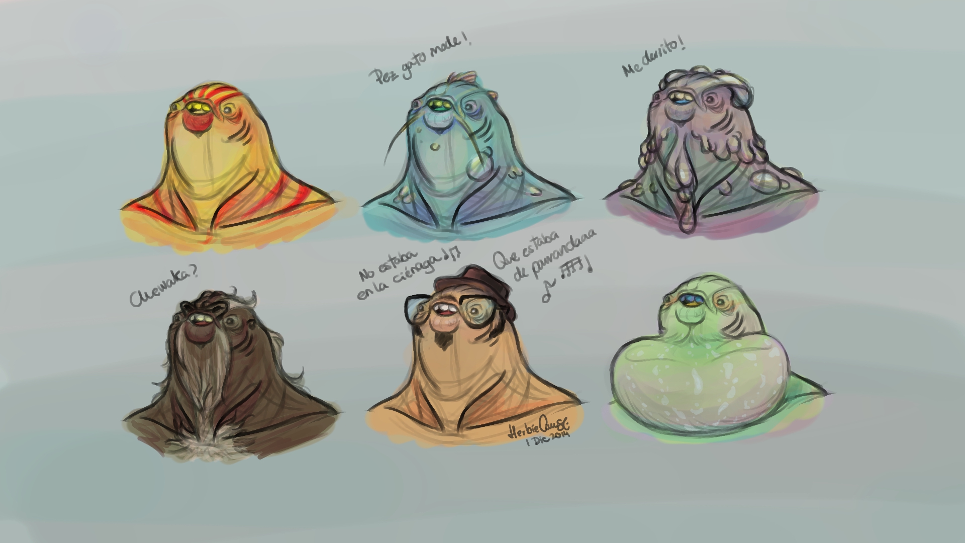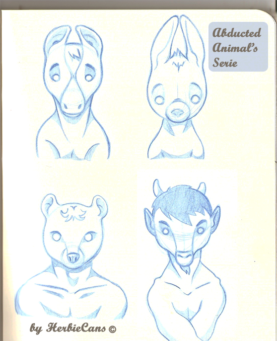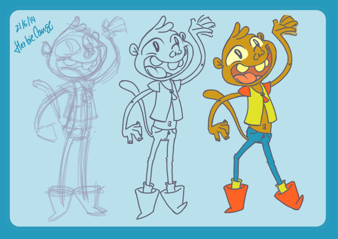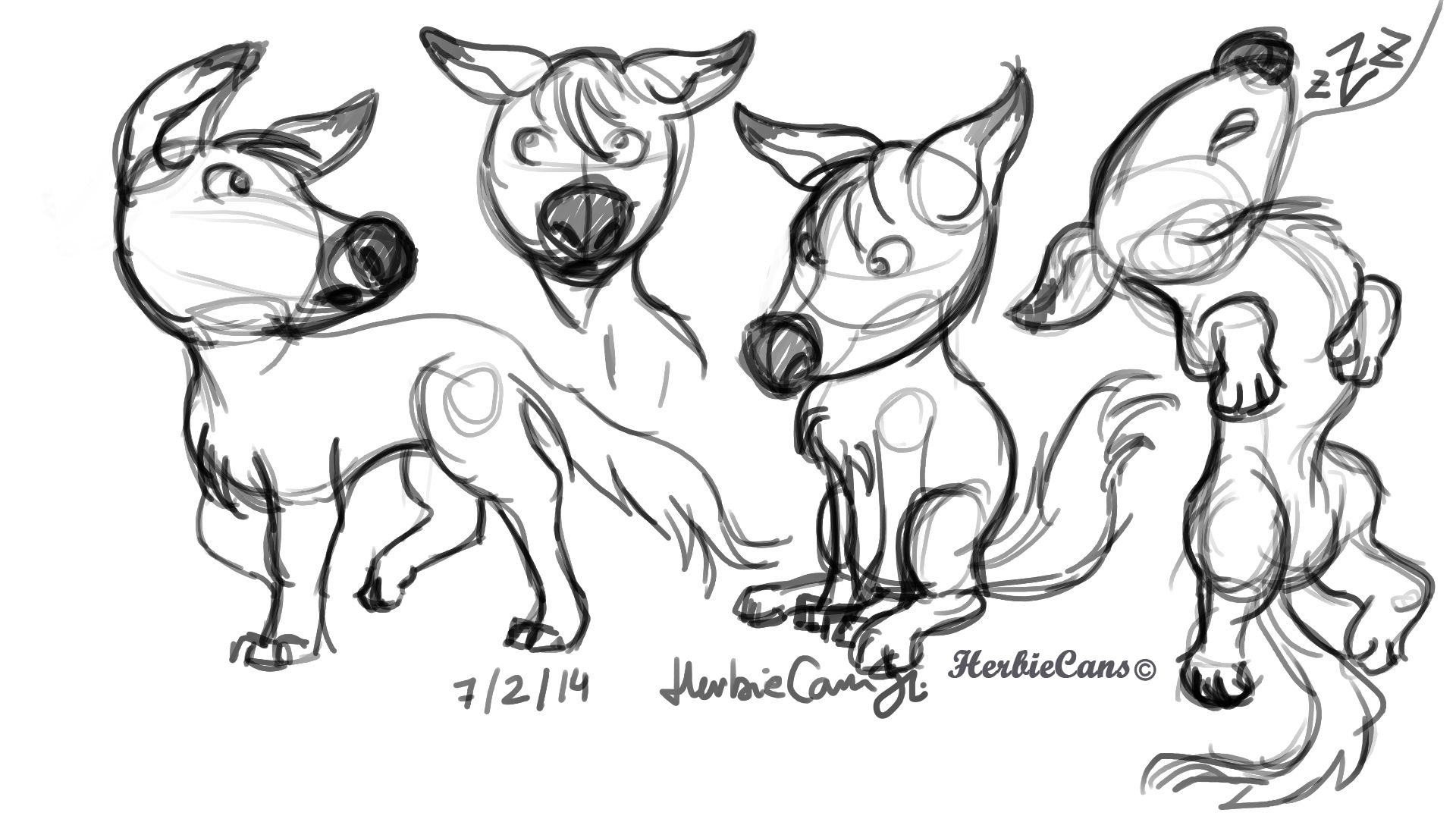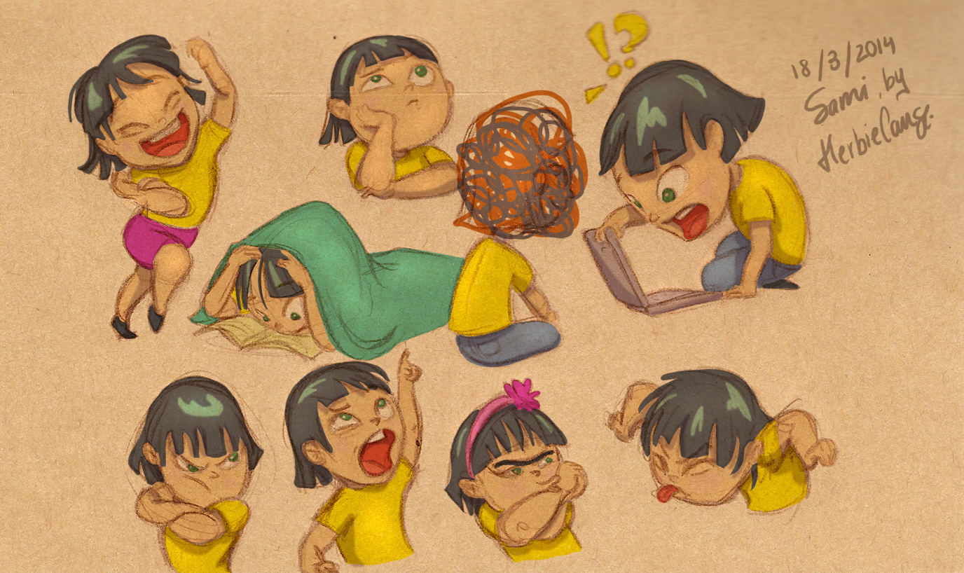 Ya que estoy, voy a subir un personaje que hice ayer. ¿Les parece que en limpio ha perdido? El boceto es más sencillo y he traducido algunas formas de manera diferente en el limpio. Por ejemplo, la pose inferior central en el boceto tiene los ojos simplemente redondos y las orejas hacia arriba. En el limpio, le metí un squash a los ojos y puse las orejas hacia abajo para favorecer la expresión, pero no sé, la sencillez del boceto le da un toque ingenuo que me llama más.