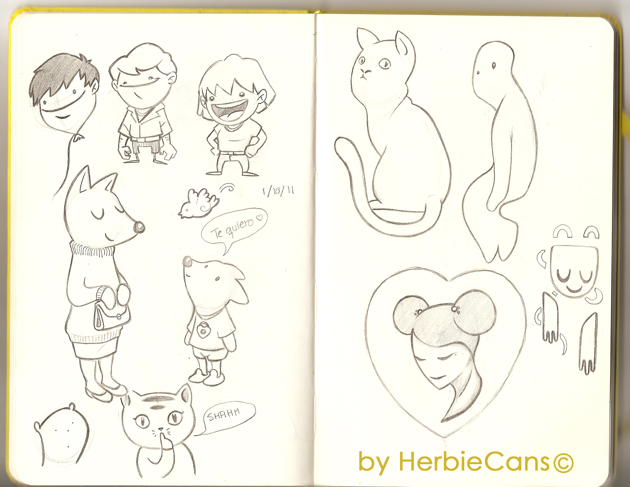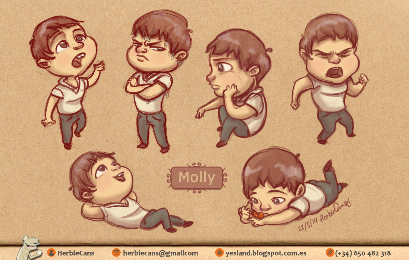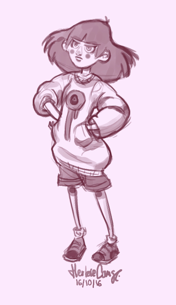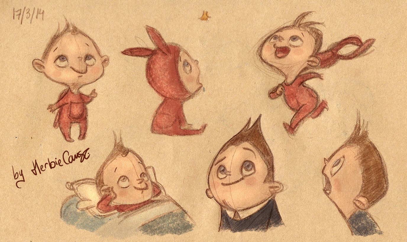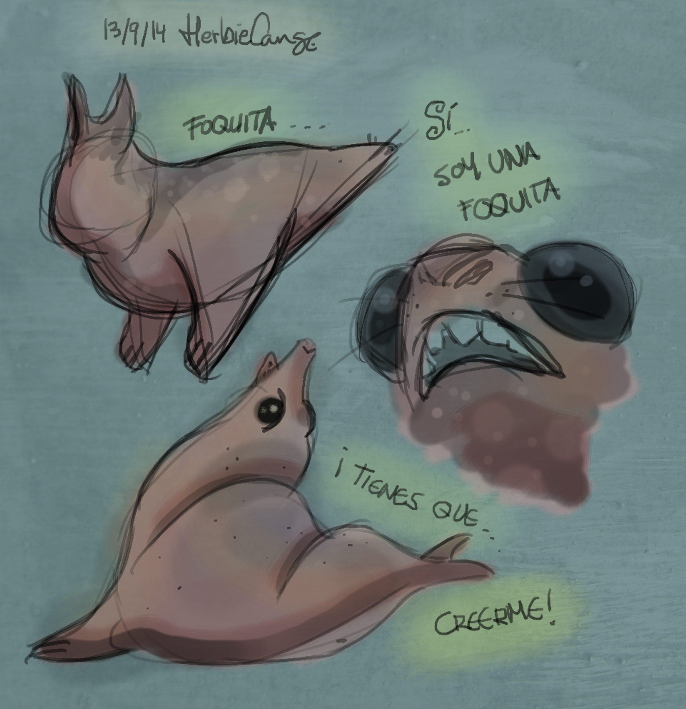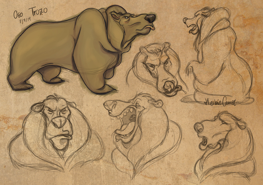 Ya que estoy, voy a subir un personaje que hice ayer. ¿Les parece que en limpio ha perdido? El boceto es más sencillo y he traducido algunas formas de manera diferente en el limpio. Por ejemplo, la pose inferior central en el boceto tiene los ojos simplemente redondos y las orejas hacia arriba. En el limpio, le metí un squash a los ojos y puse las orejas hacia abajo para favorecer la expresión, pero no sé, la sencillez del boceto le da un toque ingenuo que me llama más.