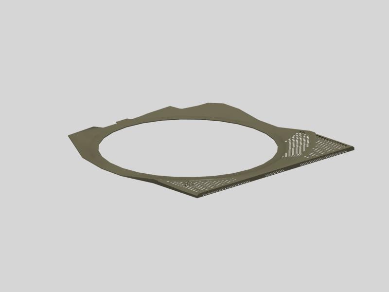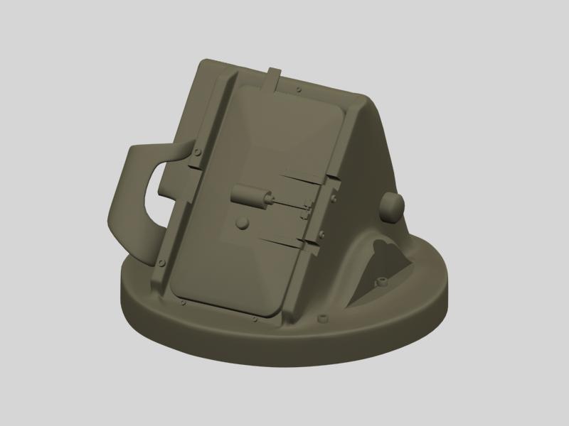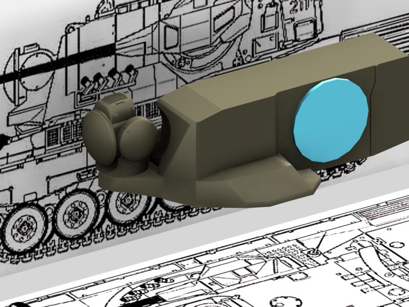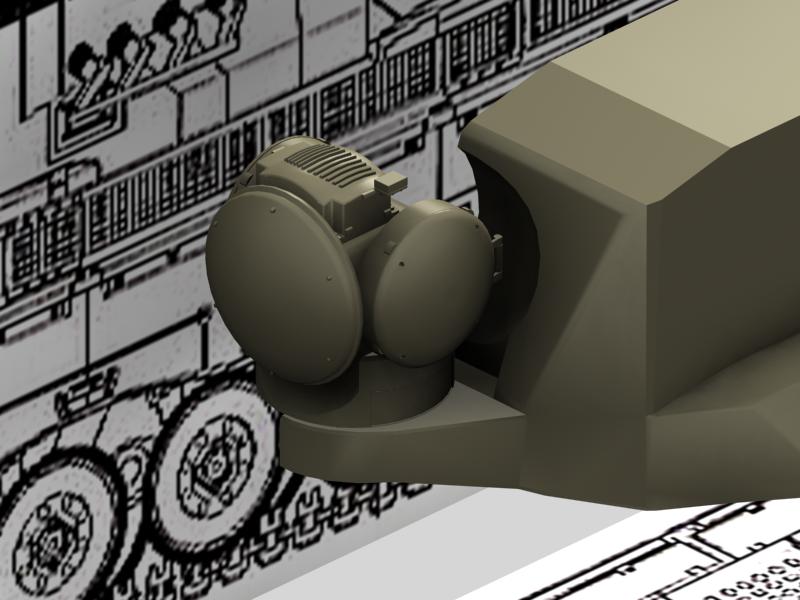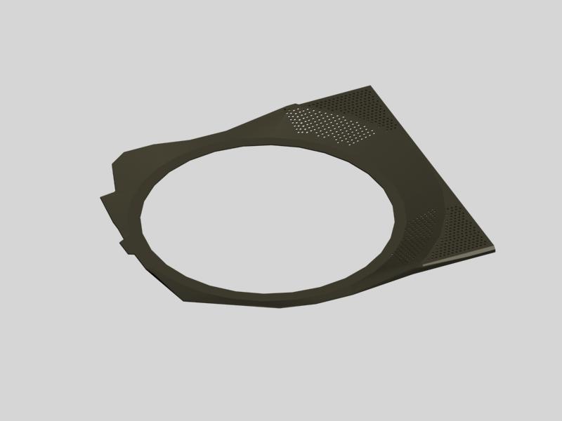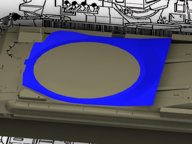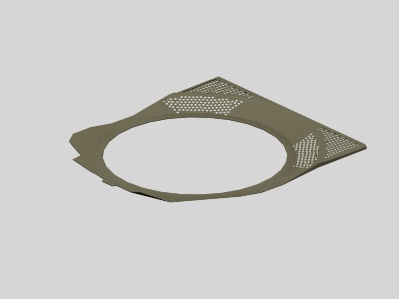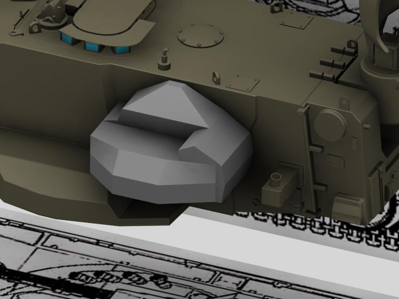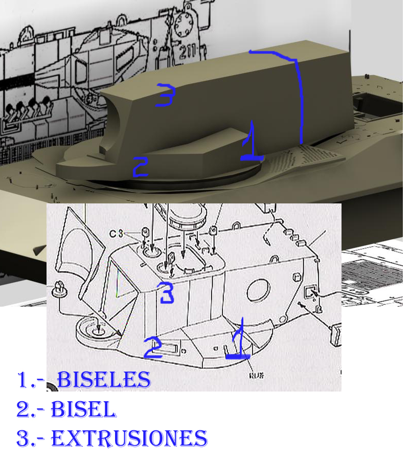 Son cuadrados, pero se le bisela para dar la sensación de fundición, pero parten de un cuadrado sacado conectando aristas y extruyendo la cara hacia dentro, con una inclinación hacia arriba, luego biselas los cantos y da la sensación de pulido y redondeado. Por dentro de la rejilla sale el tubo de escape de lo que debe de ser el motor auxiliar o del generador de la corriente que le hace falta a la torreta.