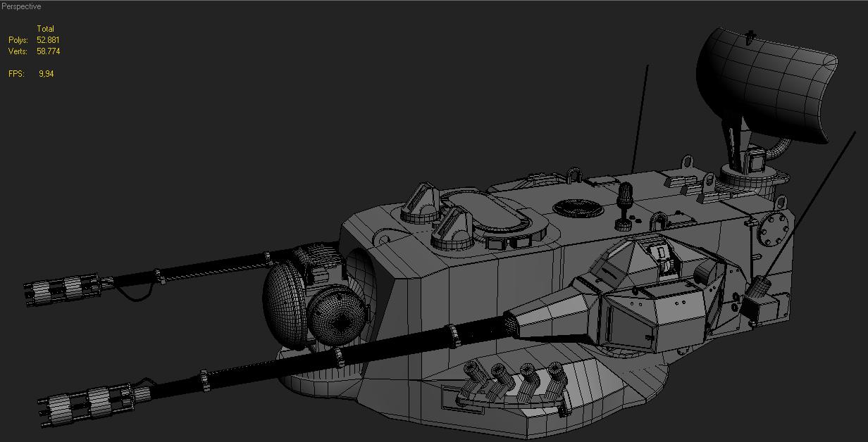 Bueno los garfios acabados, me falta la bocina y las sujeciones varias, así que, nos vamos a por el set del conductor y luego iremos hacia el otro lateral con las cajas y demás, después la famosa caceorla triangular y la torreta nos espera, bueno, no, que me falta todo el culo trasero. Lo que se ve más lo que estaba suman 83.907 polys. Es decir, retrovisores (ya con el espejo), barcaza, rejillas varias, faros, garfios y cacerola más guardabarros de goma.