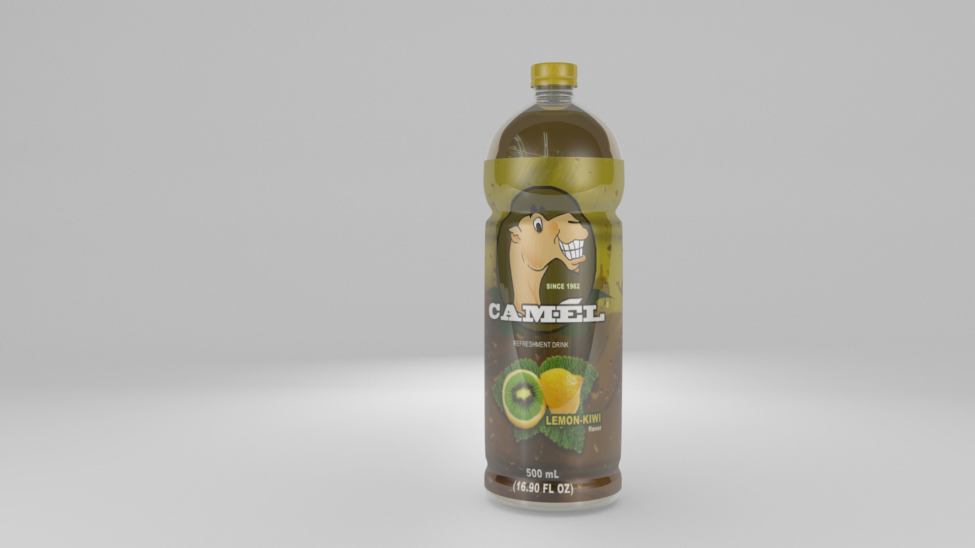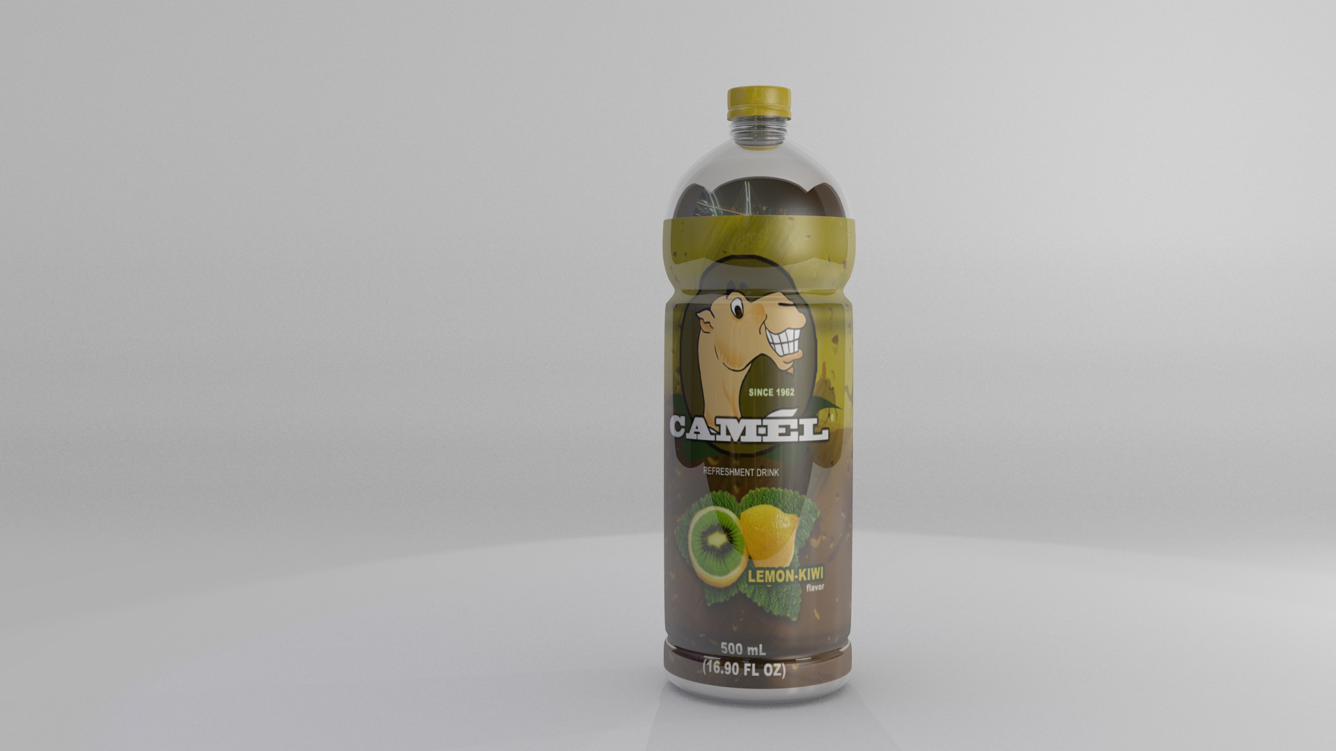 Además, el plano en el que se apoya no lo curvado del todo ya que por arriba porque se veía reflejado en la botella y quedaba la cosa un poco rara. Lo que sí he puesto es una semiesfera detrás la cámara y le puesto una textura con una imagen por ahí para que se viese reflejada un poco en la botella.