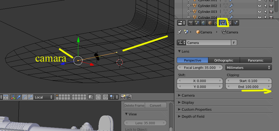 Selecciona la cámara y en Lens sube el valor de end en clipping.
