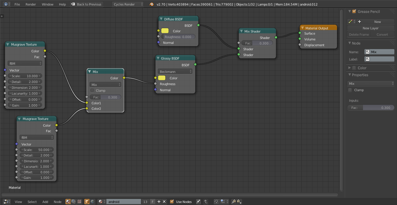 El Glossy lo suelo aplicar con Add, ya qué me parece más natural ponerle un color en el diffuse y encima añadir el color del Glossy. Add lo que hace es sumar el valor de uno y otro, en lugar de hacer un punto intermedio como es el Mix. Se podría conseguir el mismo resultado con el Mix retocando los dos colores creo, pero así me da buenos resultados.