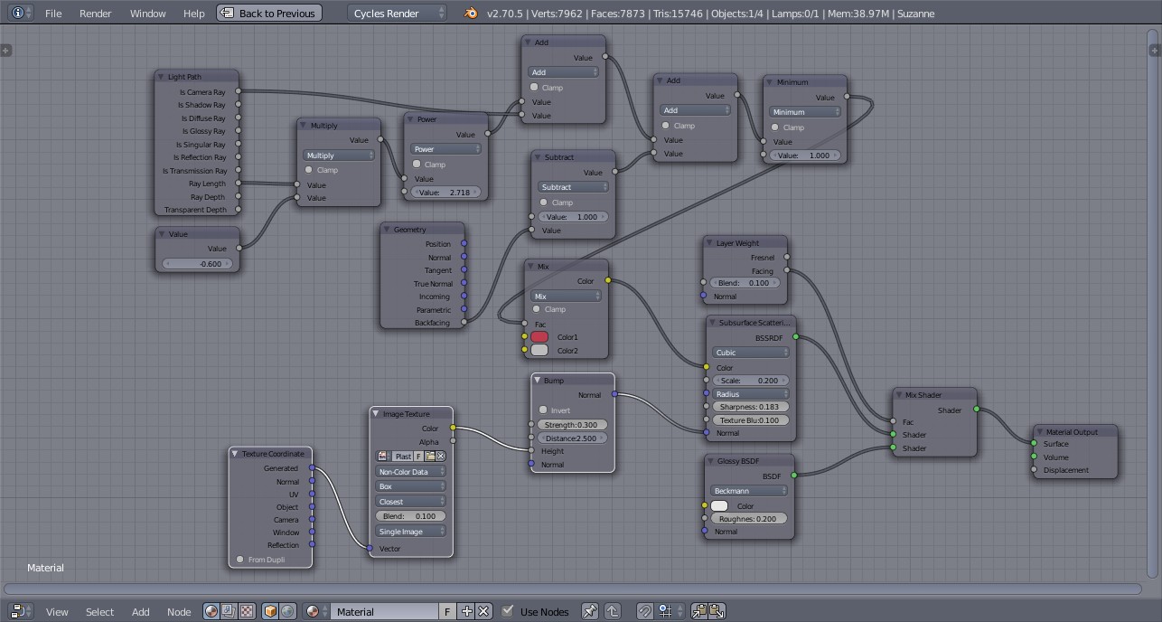 Por cierto, volviendo al tema de la optimización de materiales, más me he fijado más arriba en que al explicar el uso de las máscaras has utilizado un ejemplo en el que para mezclar dos colores, mezclabas dos shaders en lugar de mezclar los colores y conectarlos a un solo shader. Aunque ambas operación tienen el mismo resultado visual, lo cierto es que la operación donde se mezclan los dos shaders es más pesada para Cycles y tarda más en renderizarse. Procesar un Shader es más costos o para Cycles que la mayoría del resto de operación que se pueden ejecutar mediante nodos, por ello uno de los principios de eficiencia en cualquier material creado debe ser siempre el de tratar de reducir el número de shaders al mínimo estrictamente necesario. Aquí muestro un ejemplo similar a uno que ya se mostró hace tiempo en este mismo hilo cuando surgió este tema: