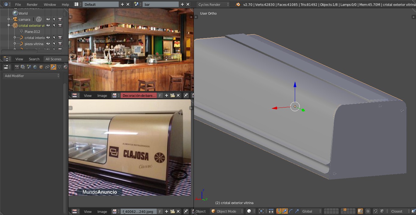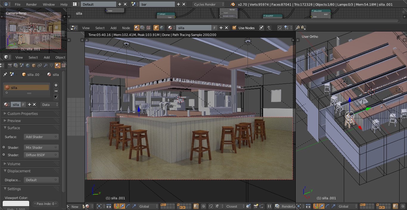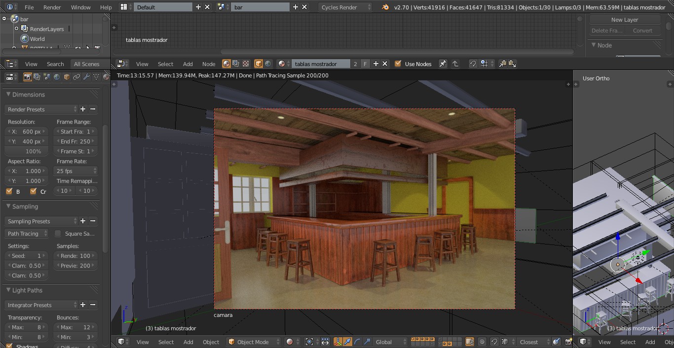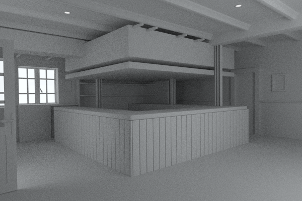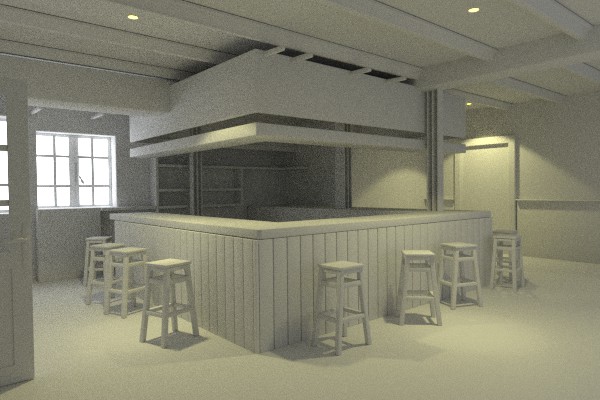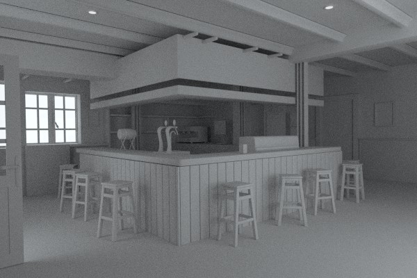 Te faltan algunos vasos, la barrica y botellas en la barra (y las numerosas botellas de arriba), así parece muy inusual en un bar. El tema de la iluminación es mucho de probar y probar, como cualquier cosa en Blender. También la puerta abierta deja pasar iluminación. Me da a mí que para los halógenos tendrás que poner focos y organizarlos. Y seguro que habrá que hacer cosas con el compositor (cuando llegue). Te va saliendo la escena. Se va pareciéndo. Yo sigo estando por aquí, pero un poco inactivo con Blender. Me estoy echando un buen vistazo a unos cuantos manuales de Gimp, que ya los iba necesitando. Saludos.