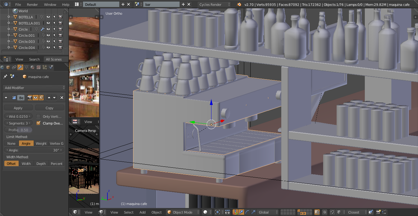 Yo las botellas las hice un grupo y las coloco con un sistema de partículas en unos planos y no le di más vueltas. Las patas de las sillas las arque un poco con la edición proporcional. No parecen igual, parecen inestables (sin el soporte de arriba); suelen estar bien reforzadas y pesan. Deben ser otro modelo de fabrica. Ya no te queda mucho de modelado.